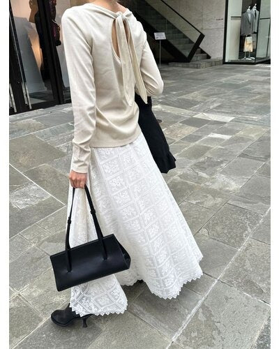 フロントはスクエアネックのすっきりとしたデザインで、上品な印象に。