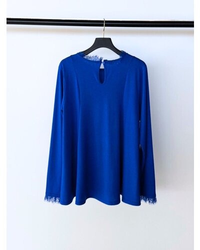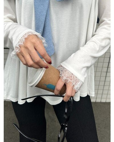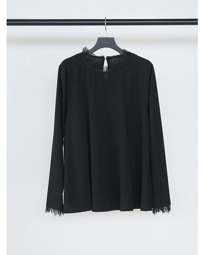 襟元と袖口にあしらった繊細なレースが、さりげなく女性らしさを添えるフレアトップス。