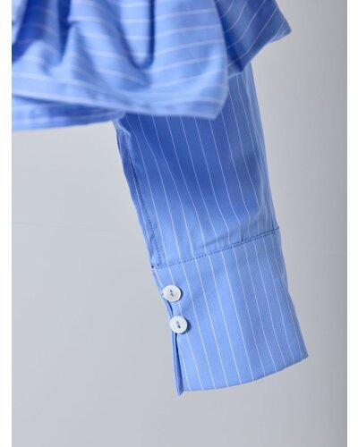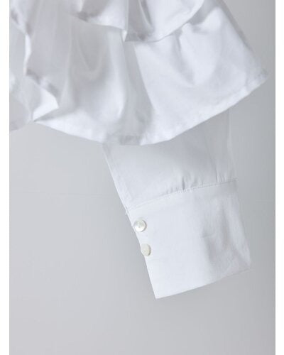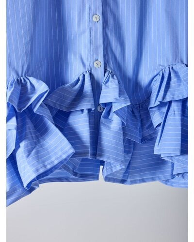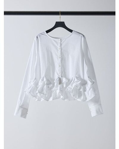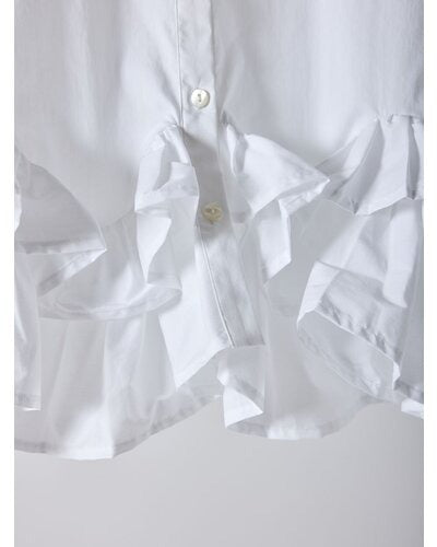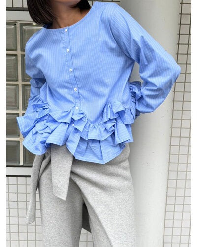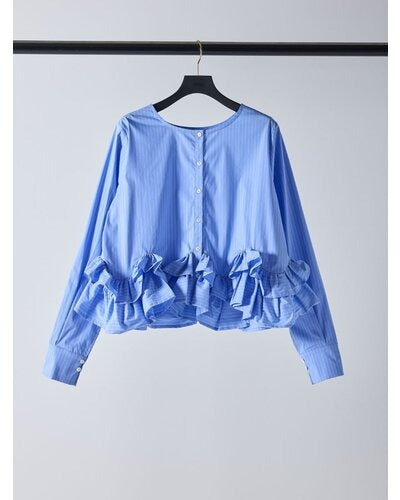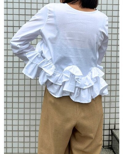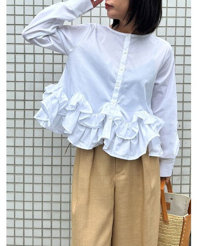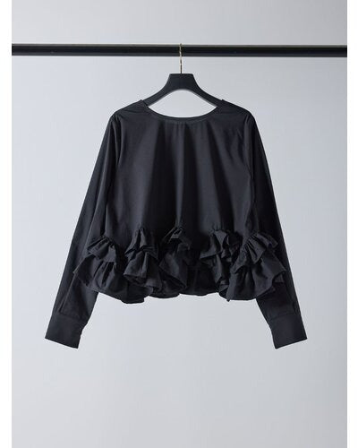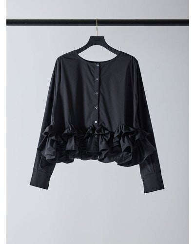 裾にたっぷりとフリルを重ねたペプラムデザインが目を引く一枚。