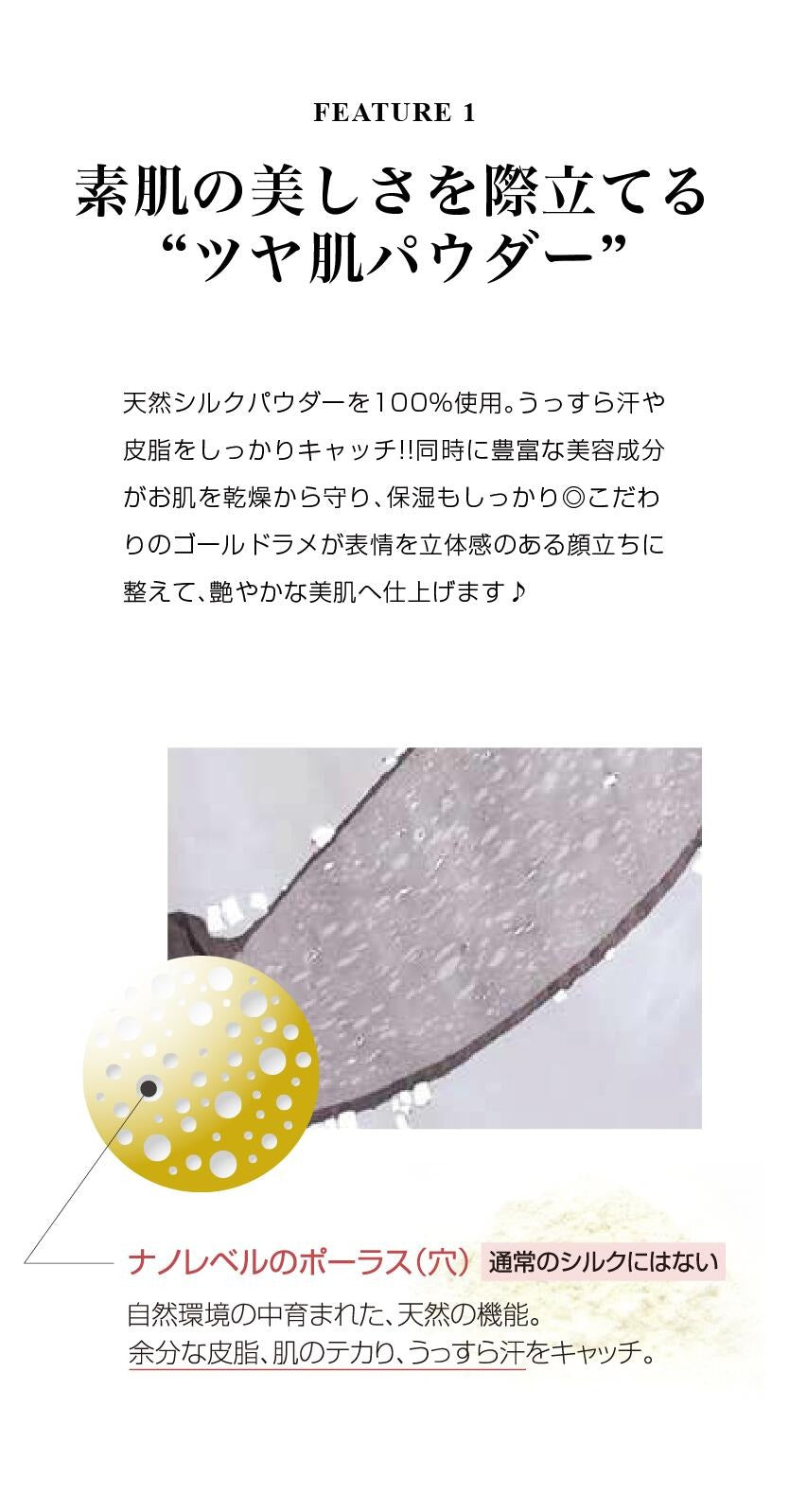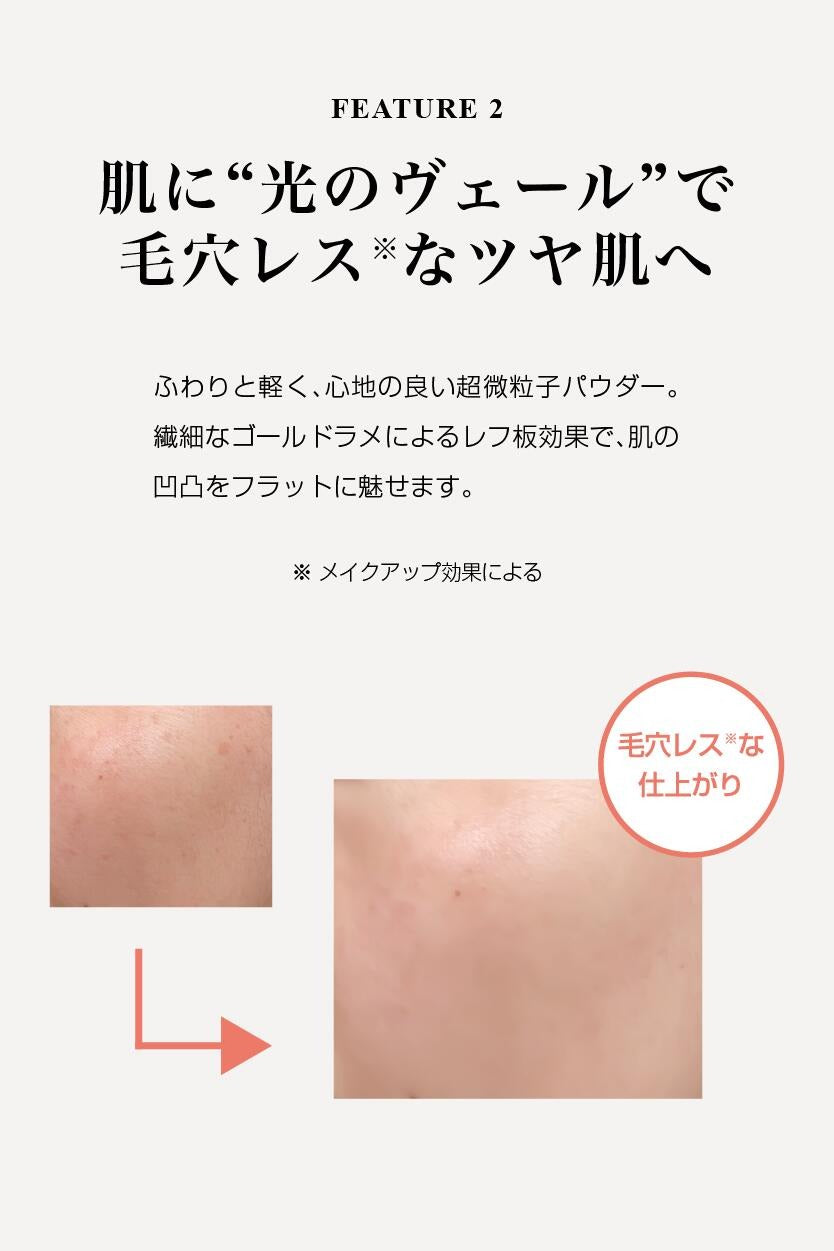 肌に光のヴェールで毛穴レスなツヤ肌へ。ふわりと軽く、心地の良い超微粒子パウダー。繊細な天然のパールによるレフ板効果で、肌の凹凸をフラットに魅せる天然シルク100%のしっとり質感パウダー。