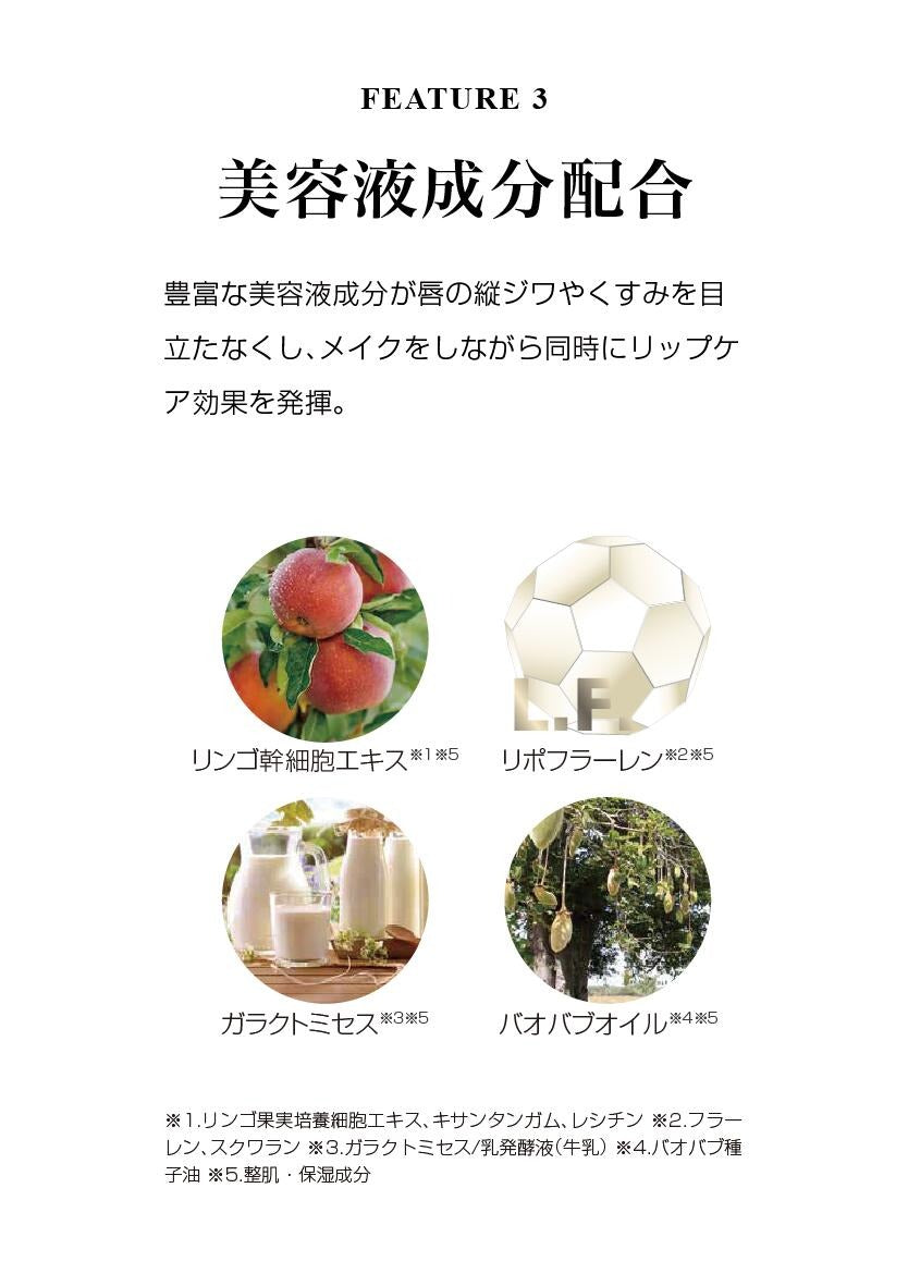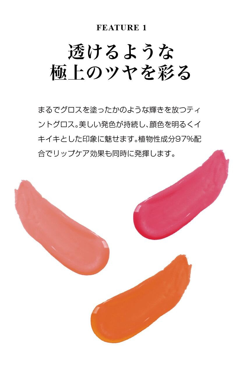 透けるような極上のツヤを彩るティント。まるでグロスを塗ったかのような輝きを放ちます。植物成分97%配合でリップケア効果も同時に発揮。エレガントで肌の色を綺麗に見せてくれる。