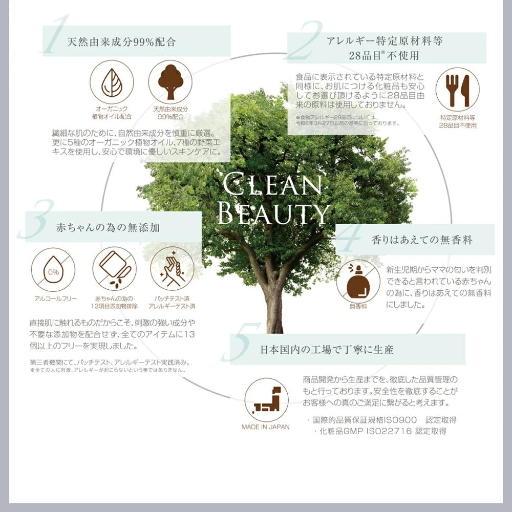 デリケートな0歳の赤ちゃんの全身を優しく潤す成分は、アレルギー特定原料28品目を全く使わないのはもちろん、13項目の添加物を徹底排除。また、アレルギーテストやパッチテスト※2 もクリアしています。