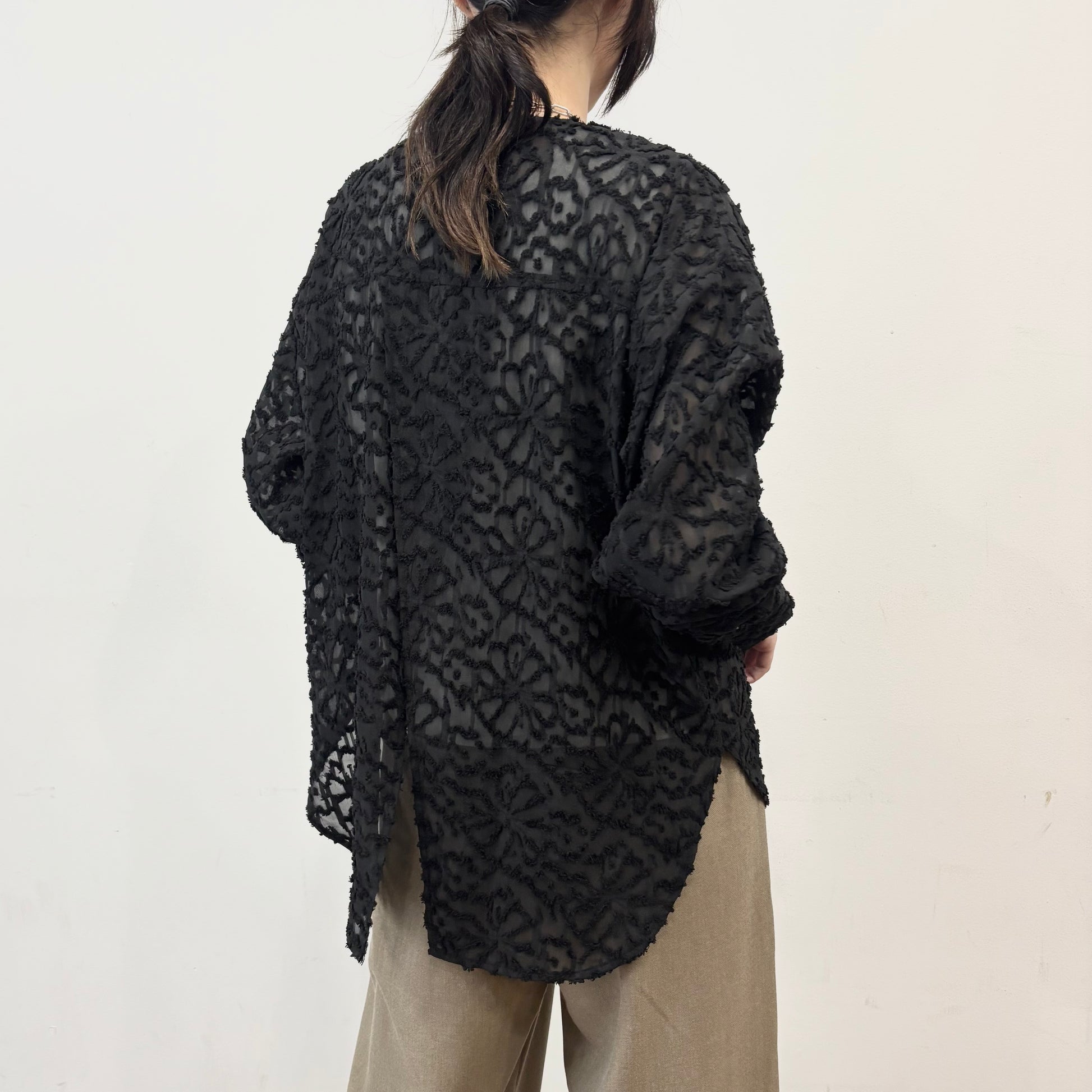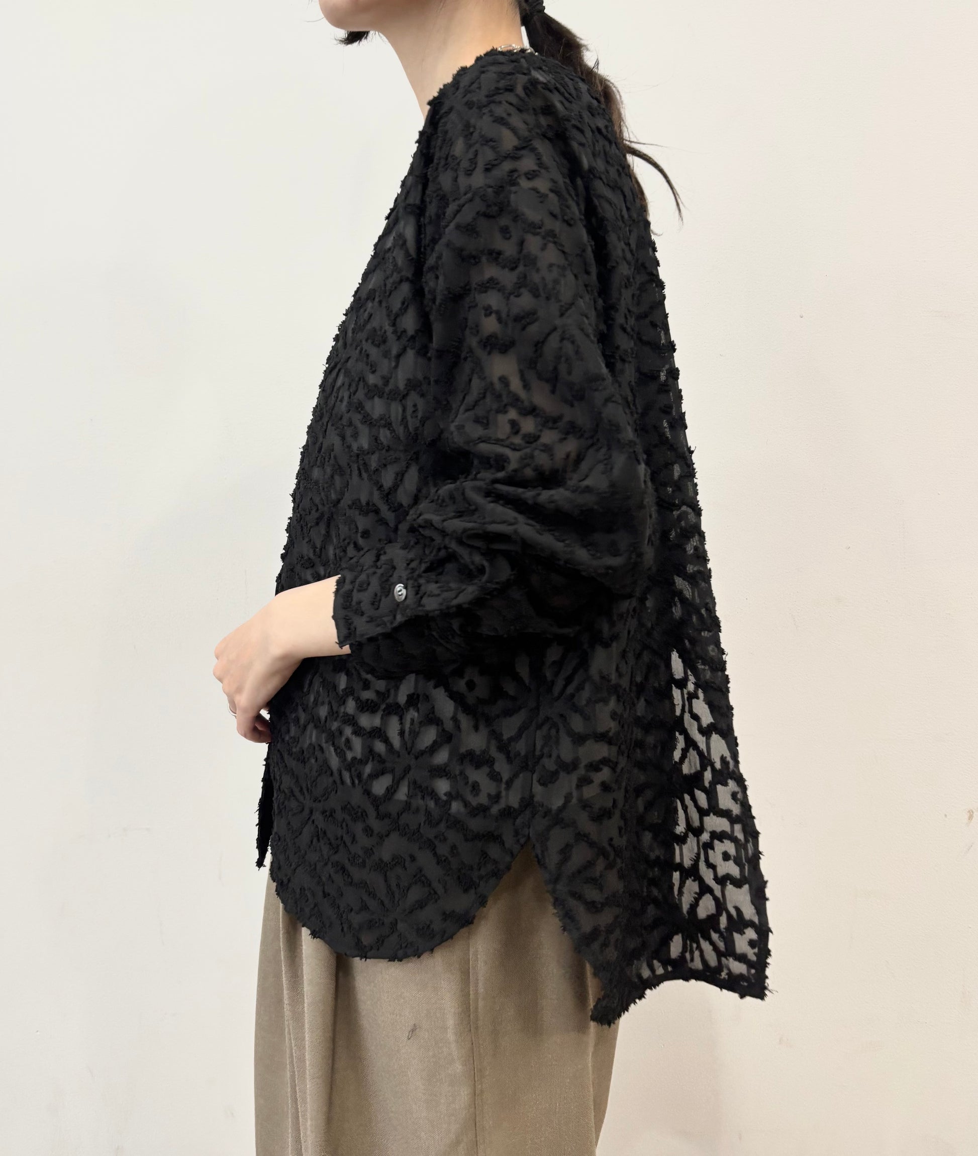 立体感のある表情豊かなカットジャガード素材を使用したノーカラーシャツ。