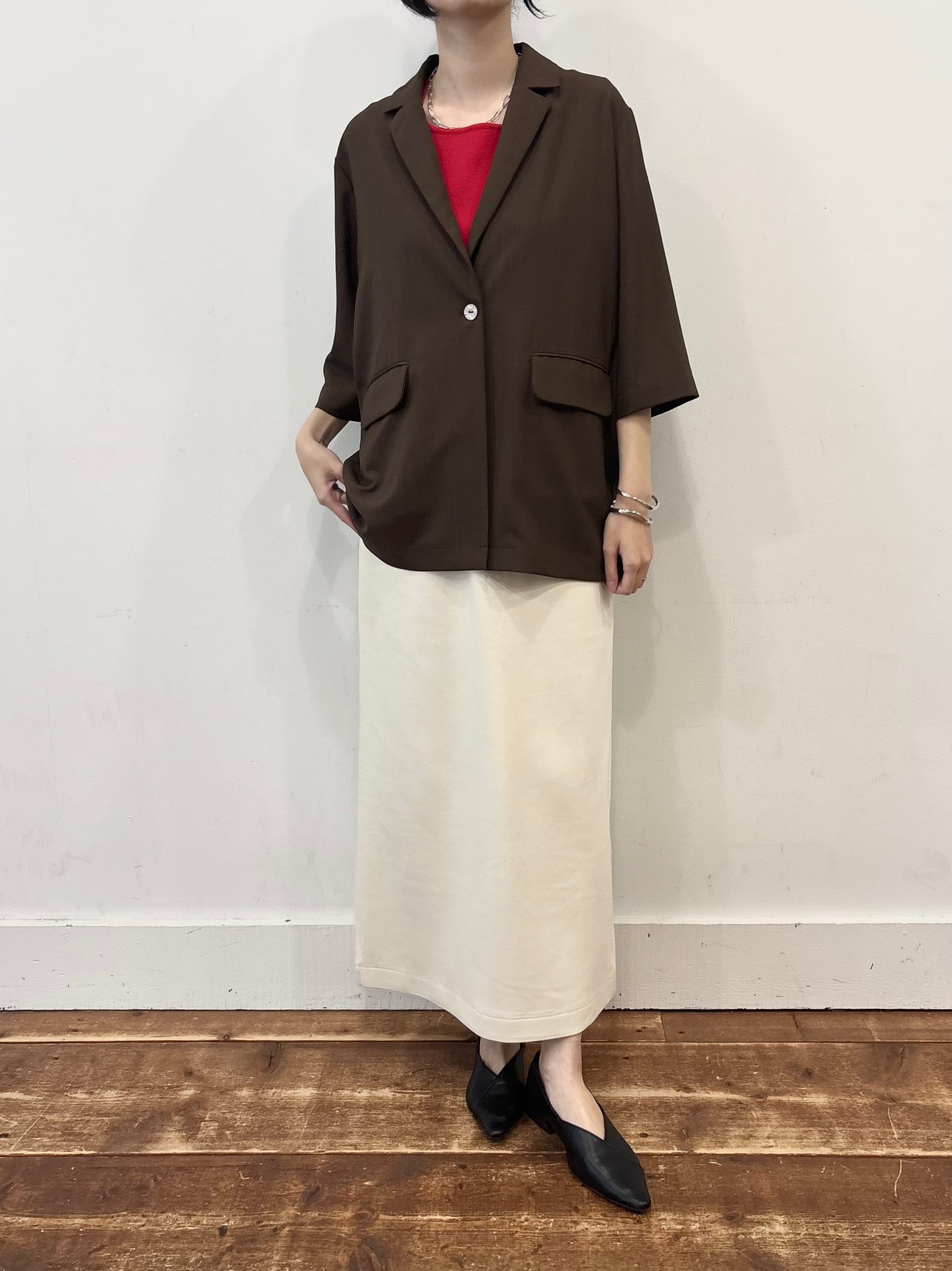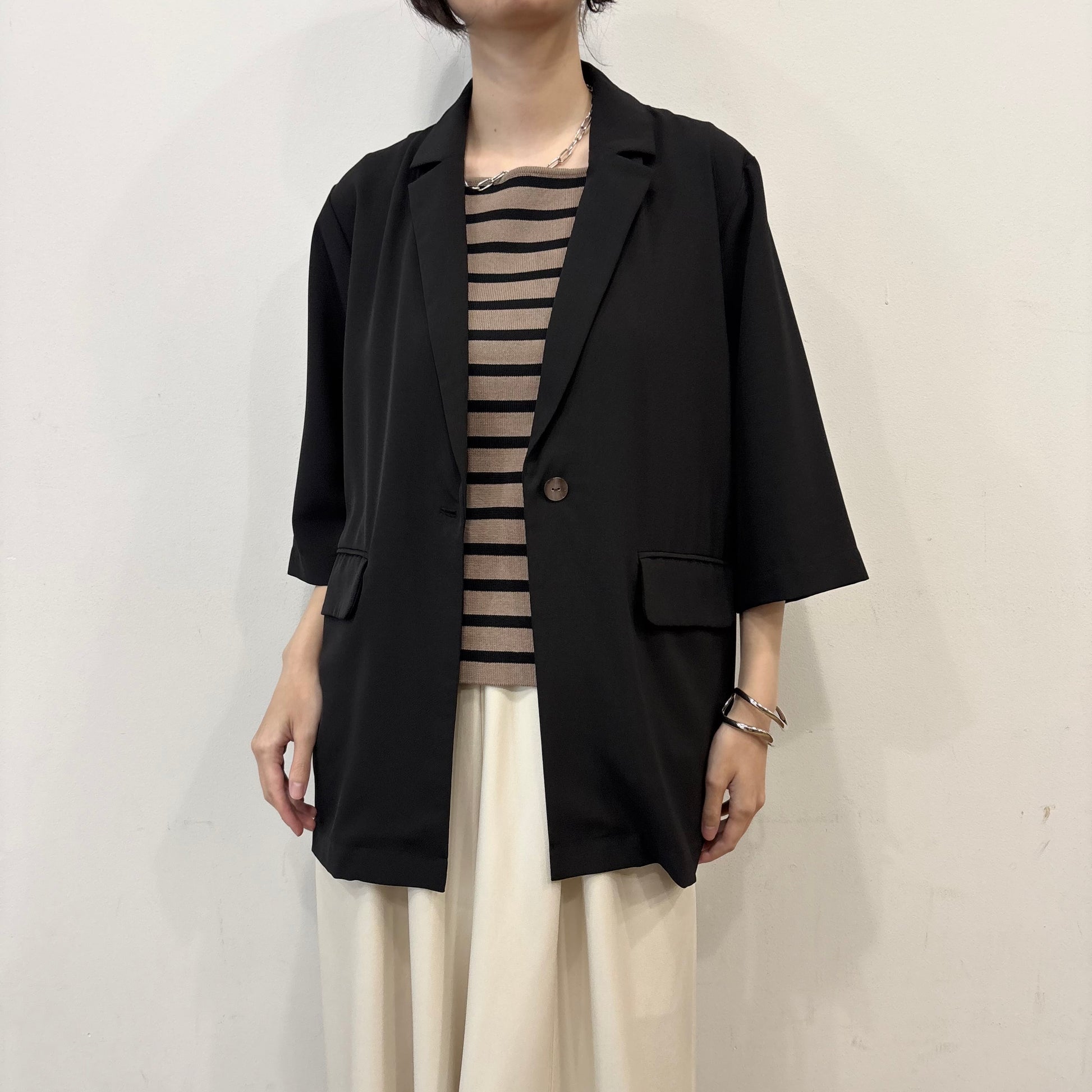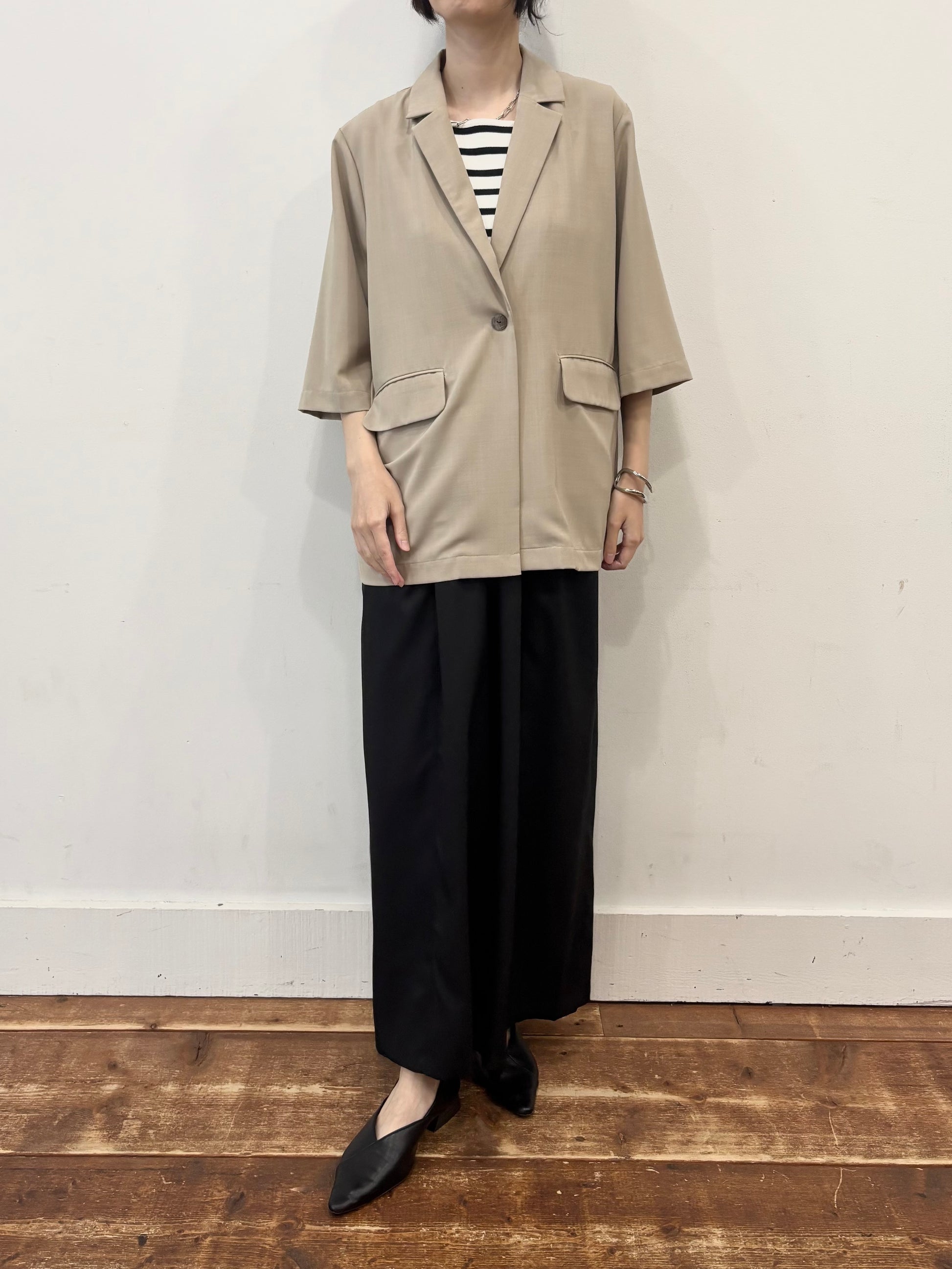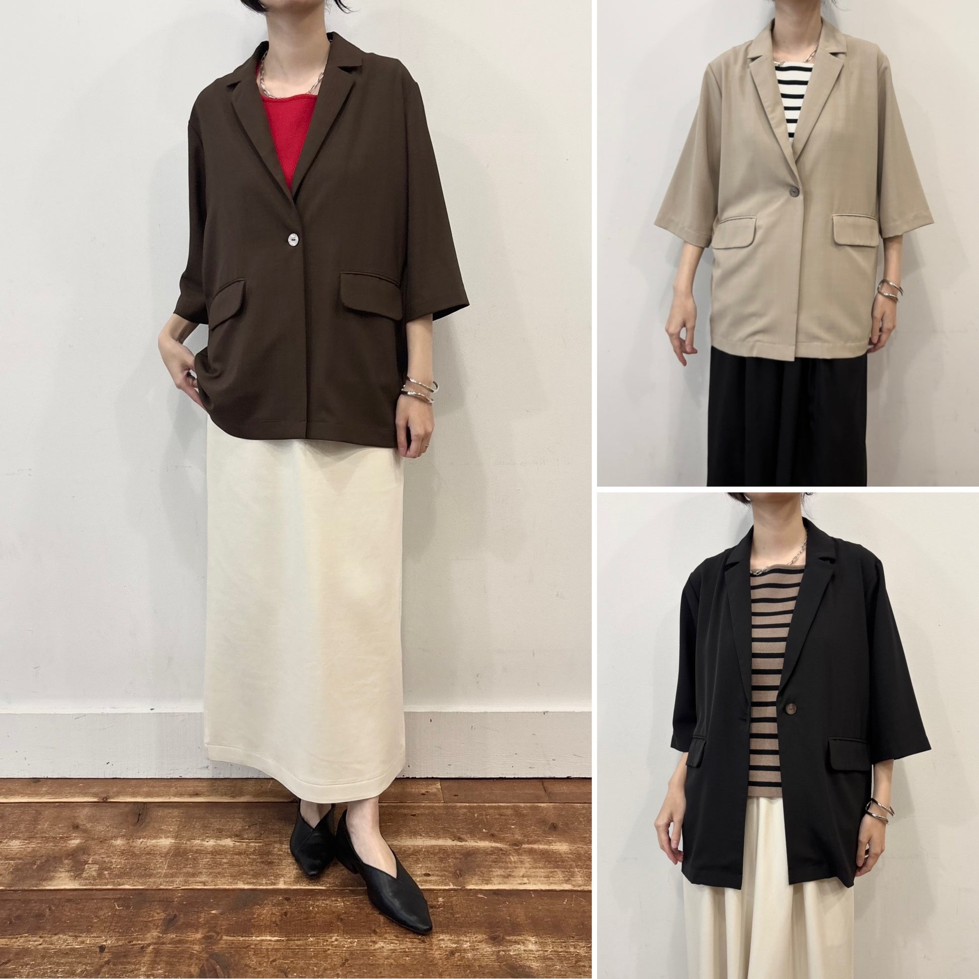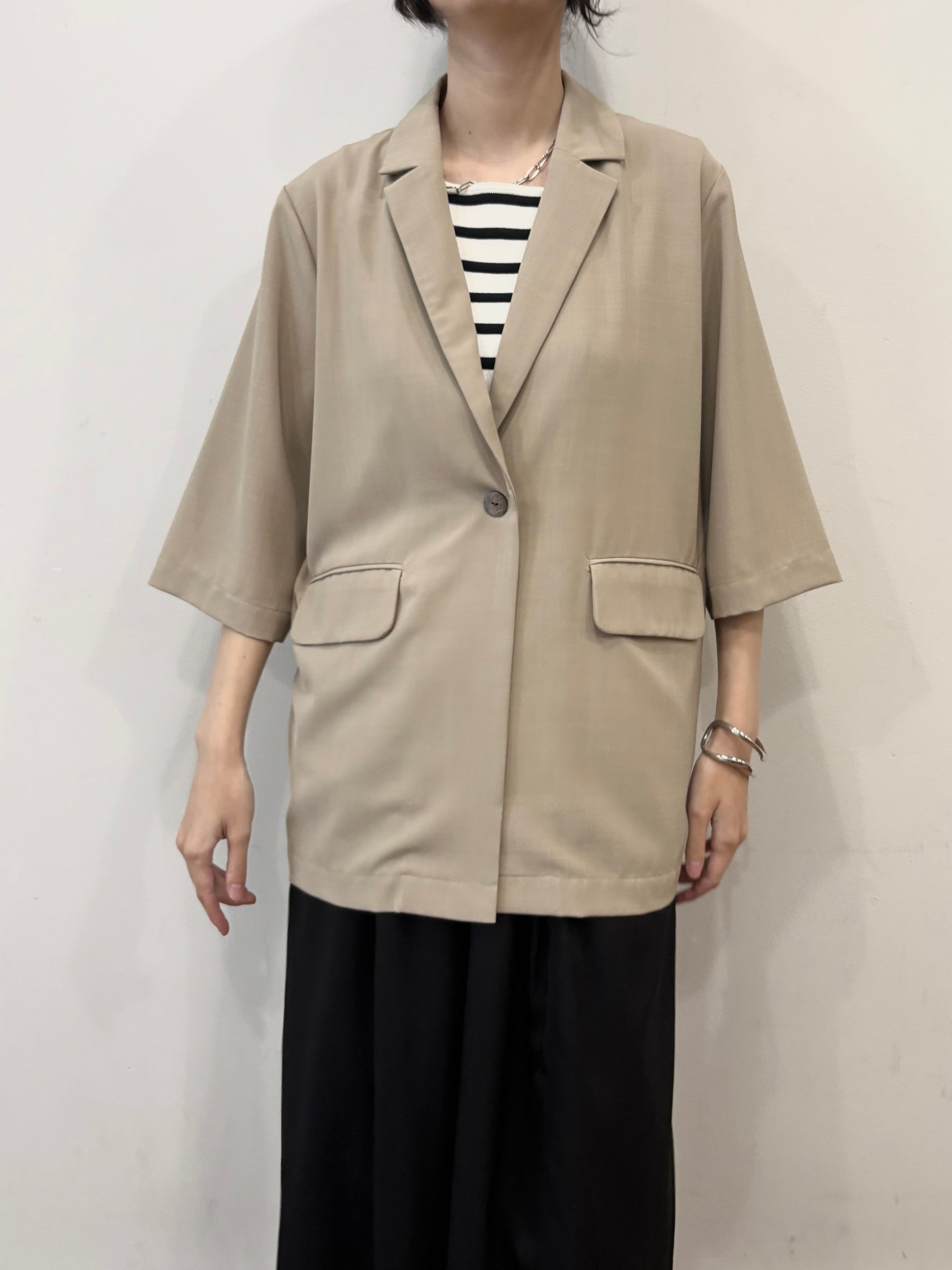 テーラードタイプの半袖ジャケットは袖丈が肘が隠れるくらいのやや長めになっております。