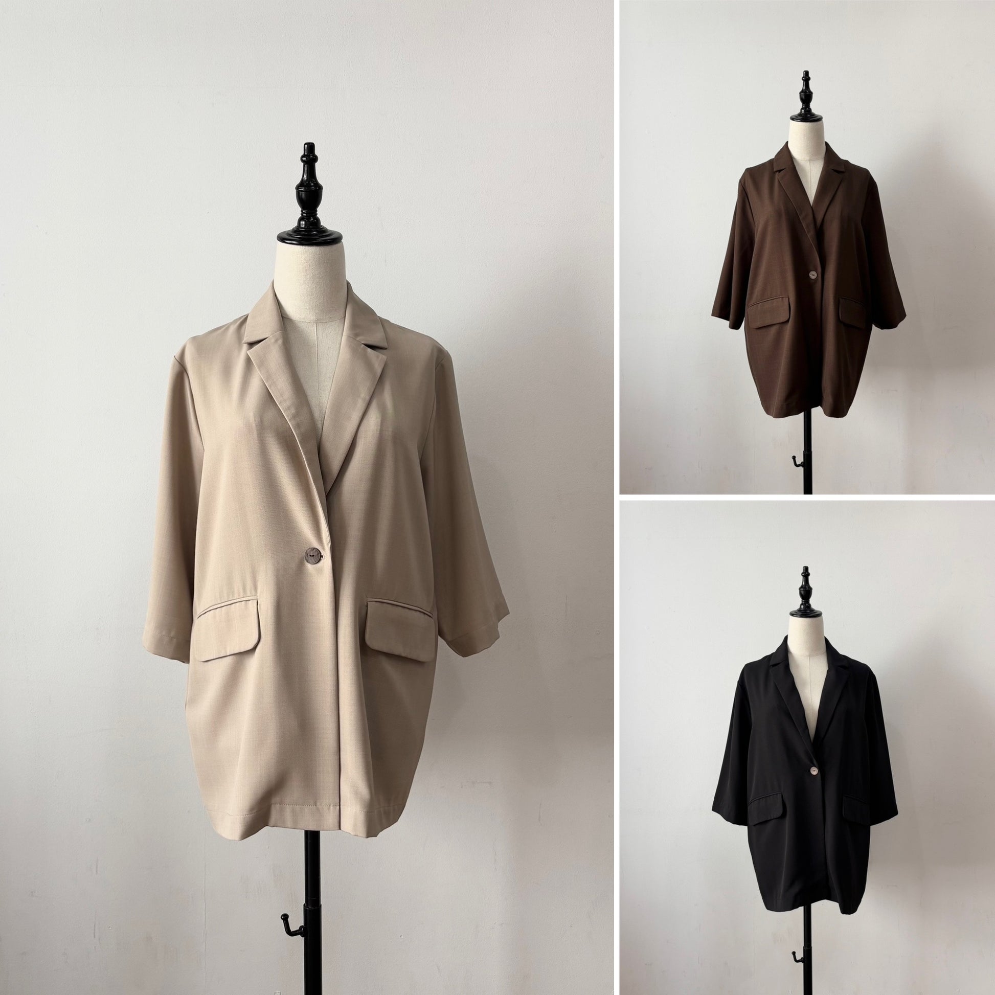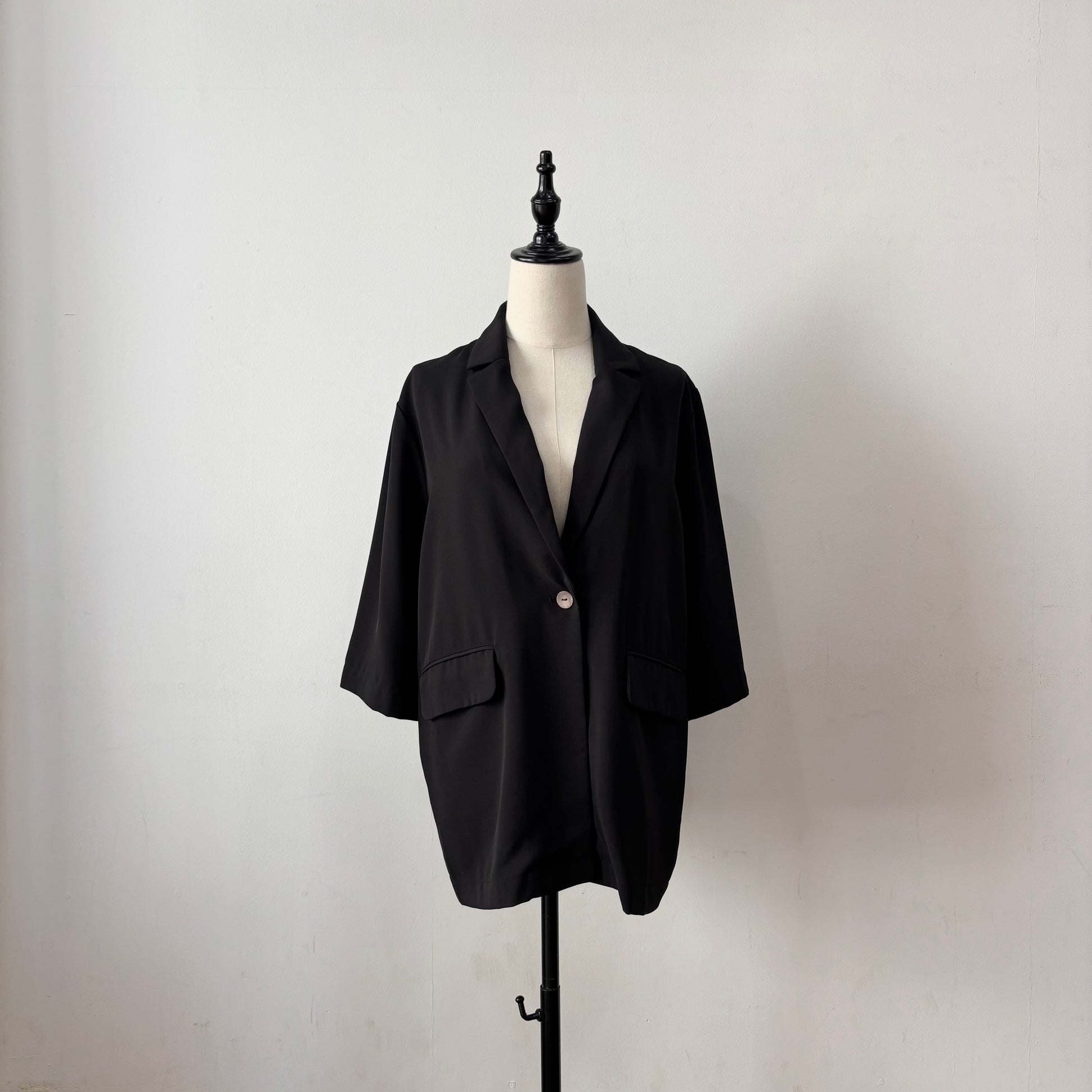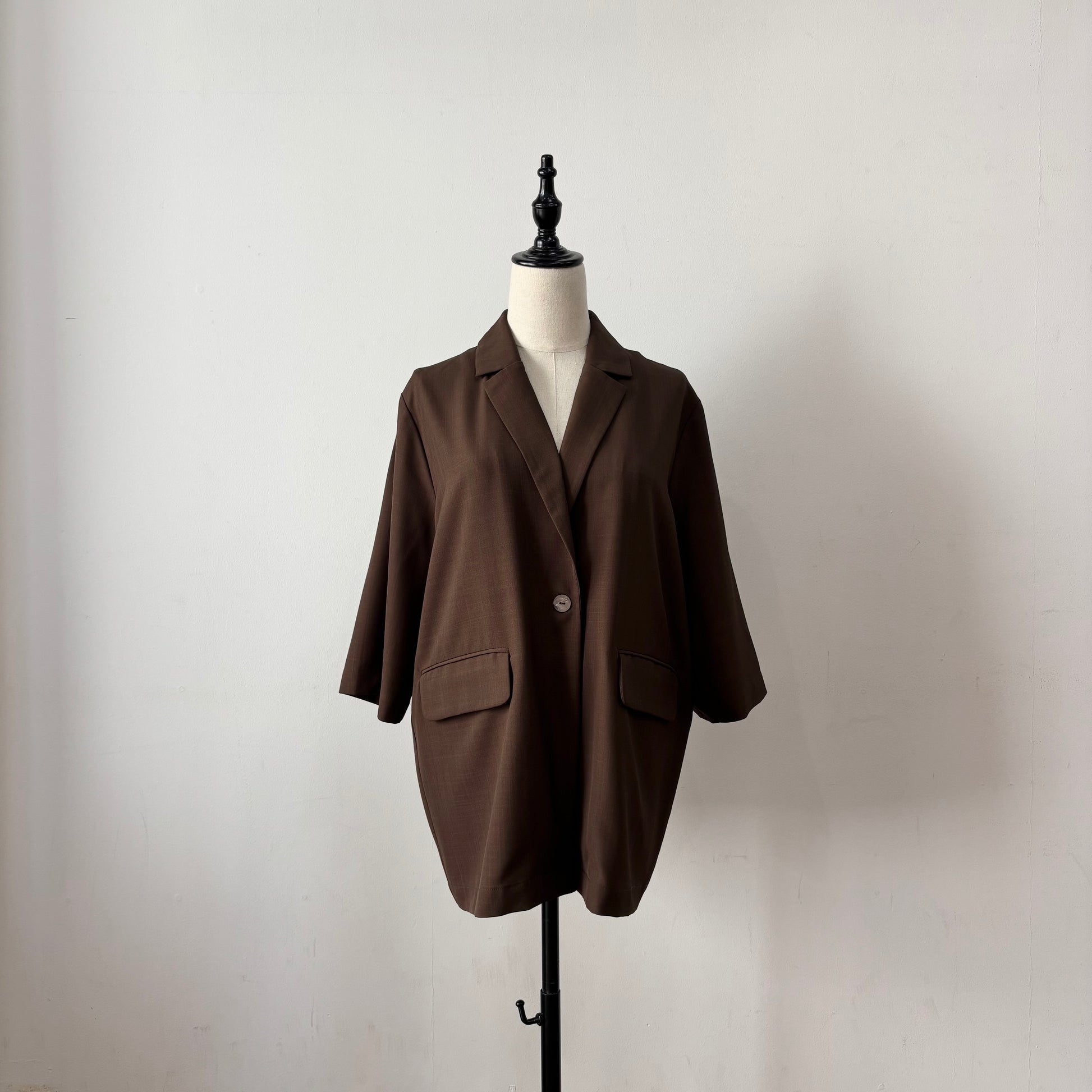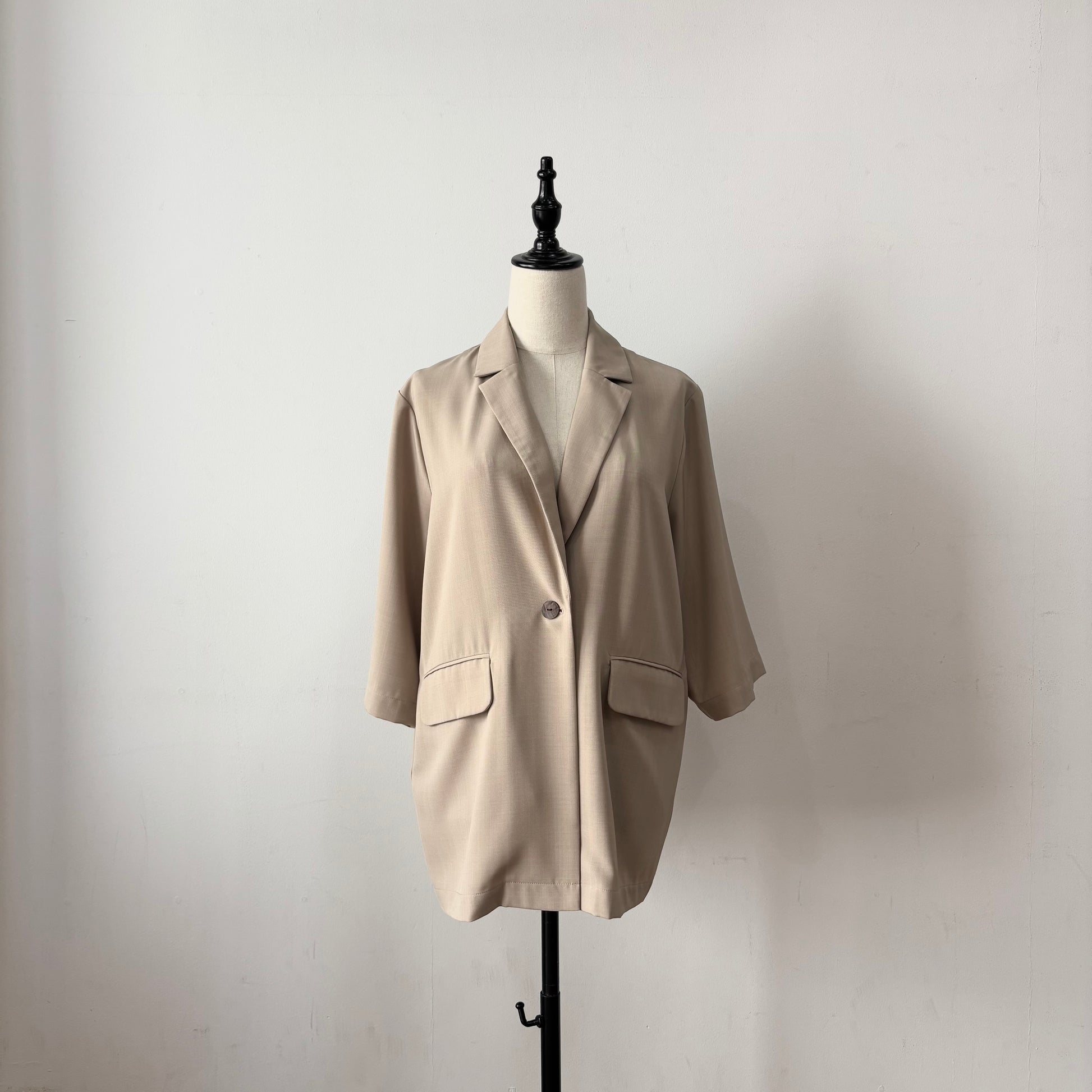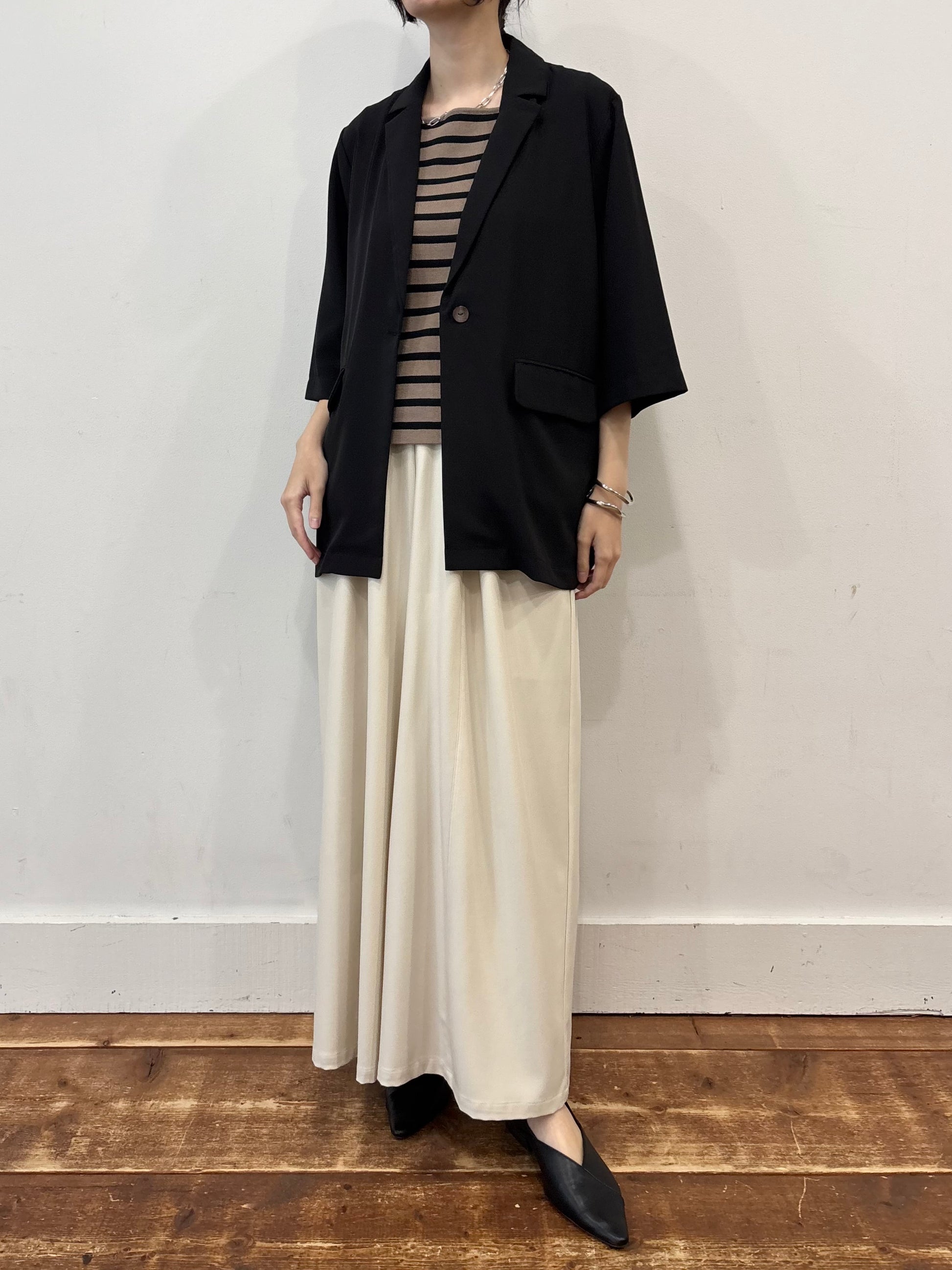 テーラードタイプの半袖ジャケットは袖丈が肘が隠れるくらいのやや長めになっております。