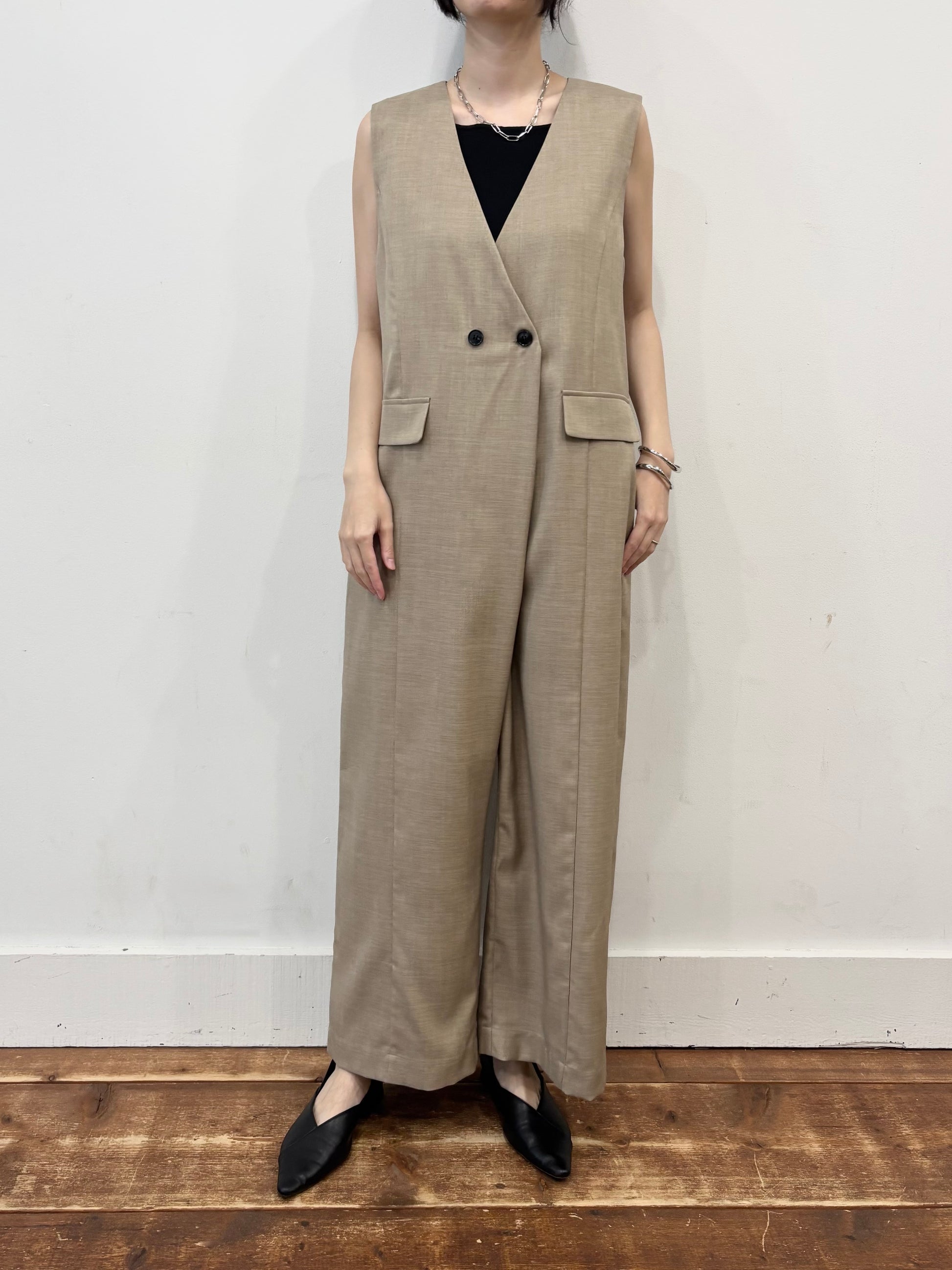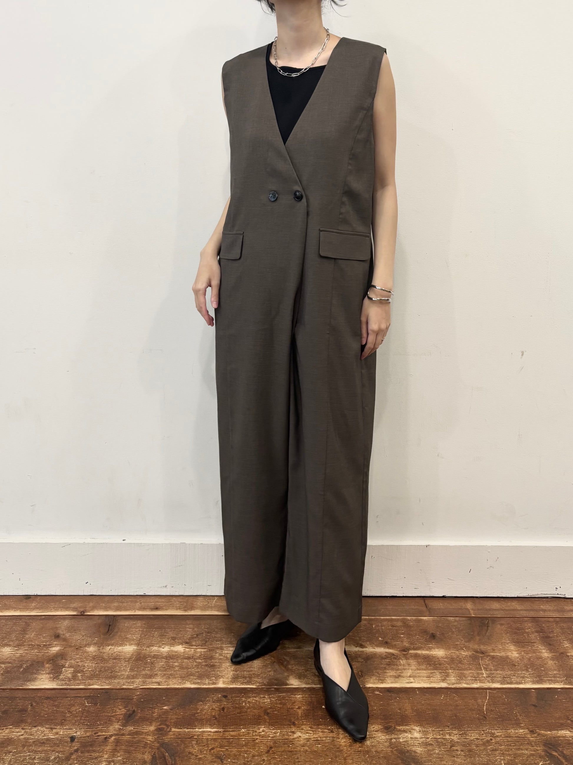 ダブルボタンやフラップポケットなどのジャケットのデザインを取り入れたオールインワン。