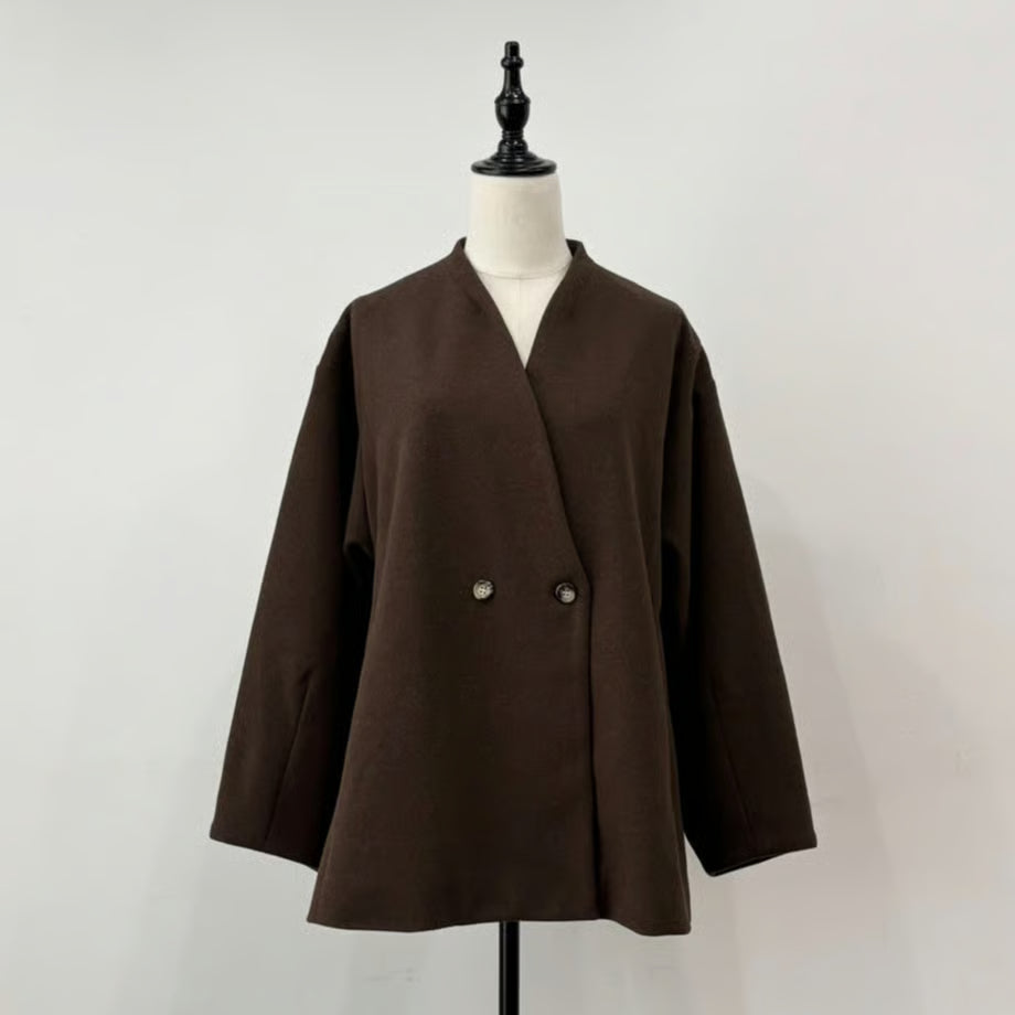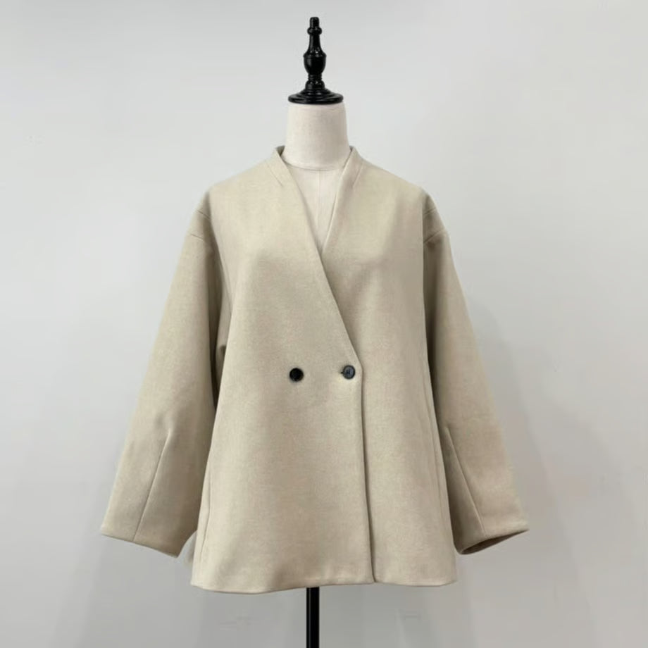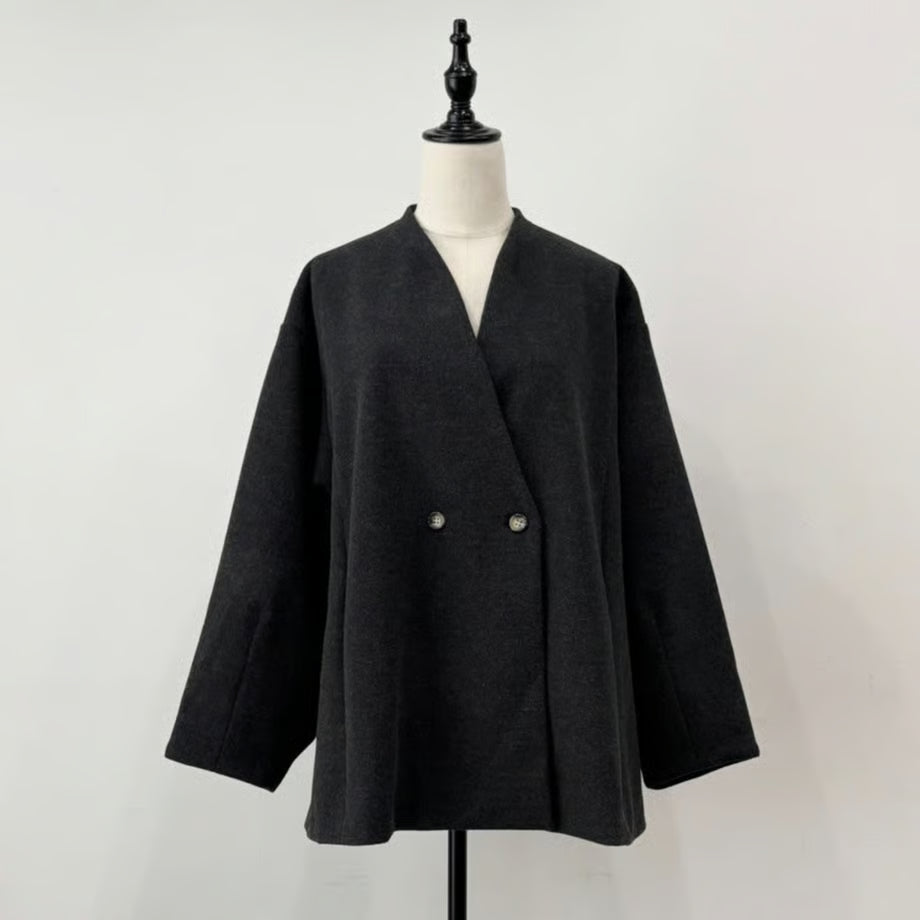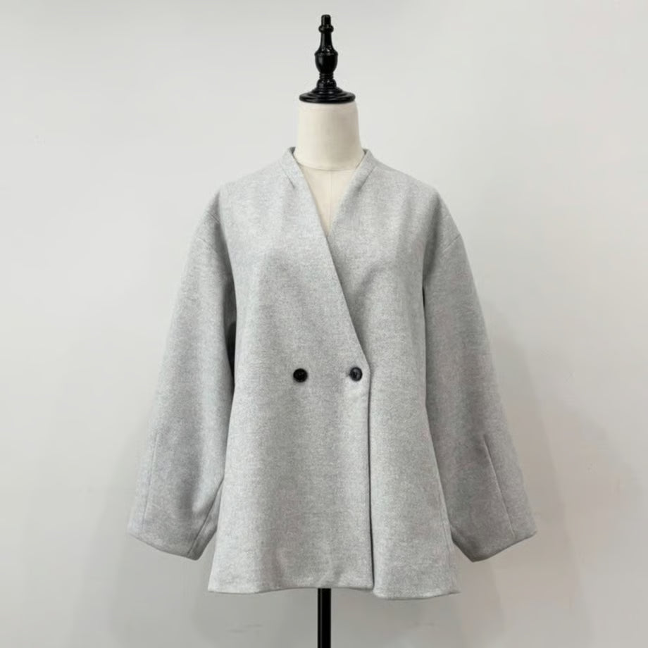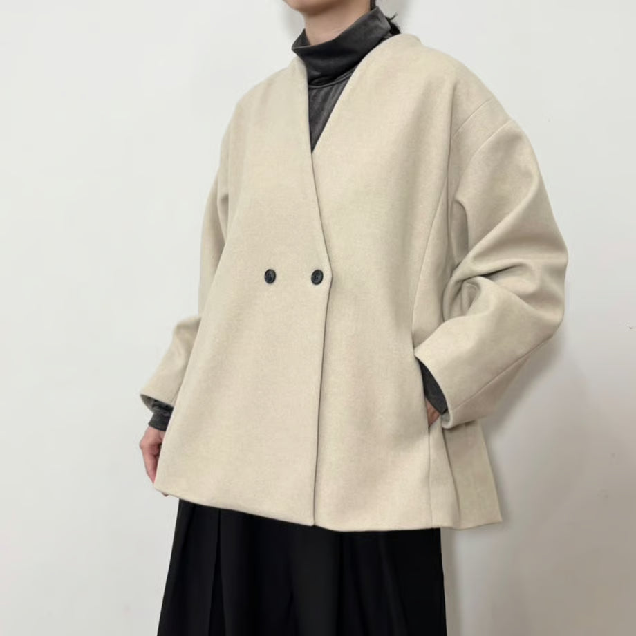 ダーツを入れて丸いシルエットの袖が特徴的なノーカラージャケット。