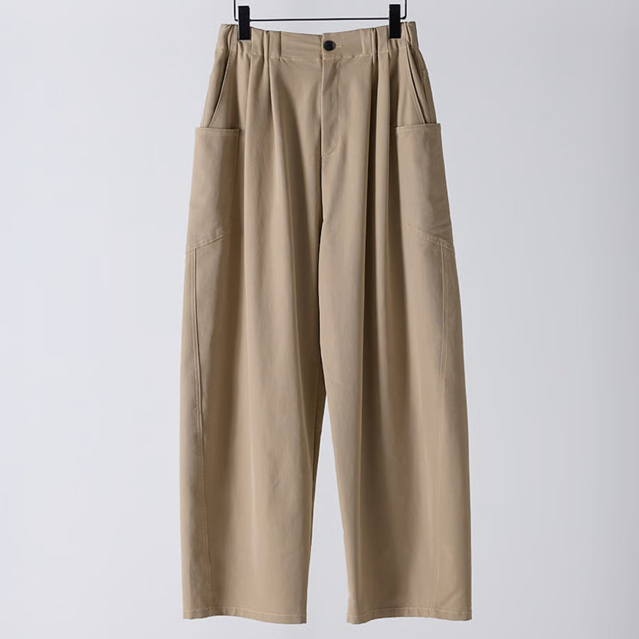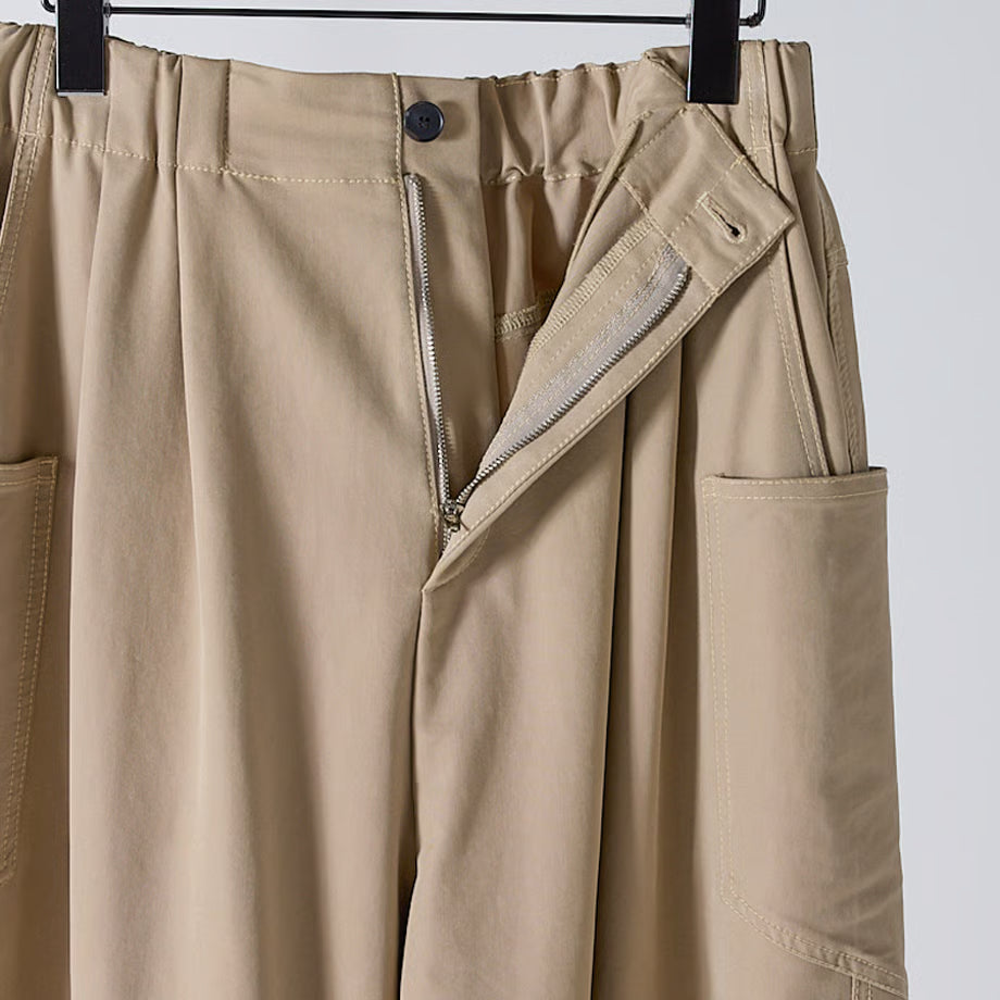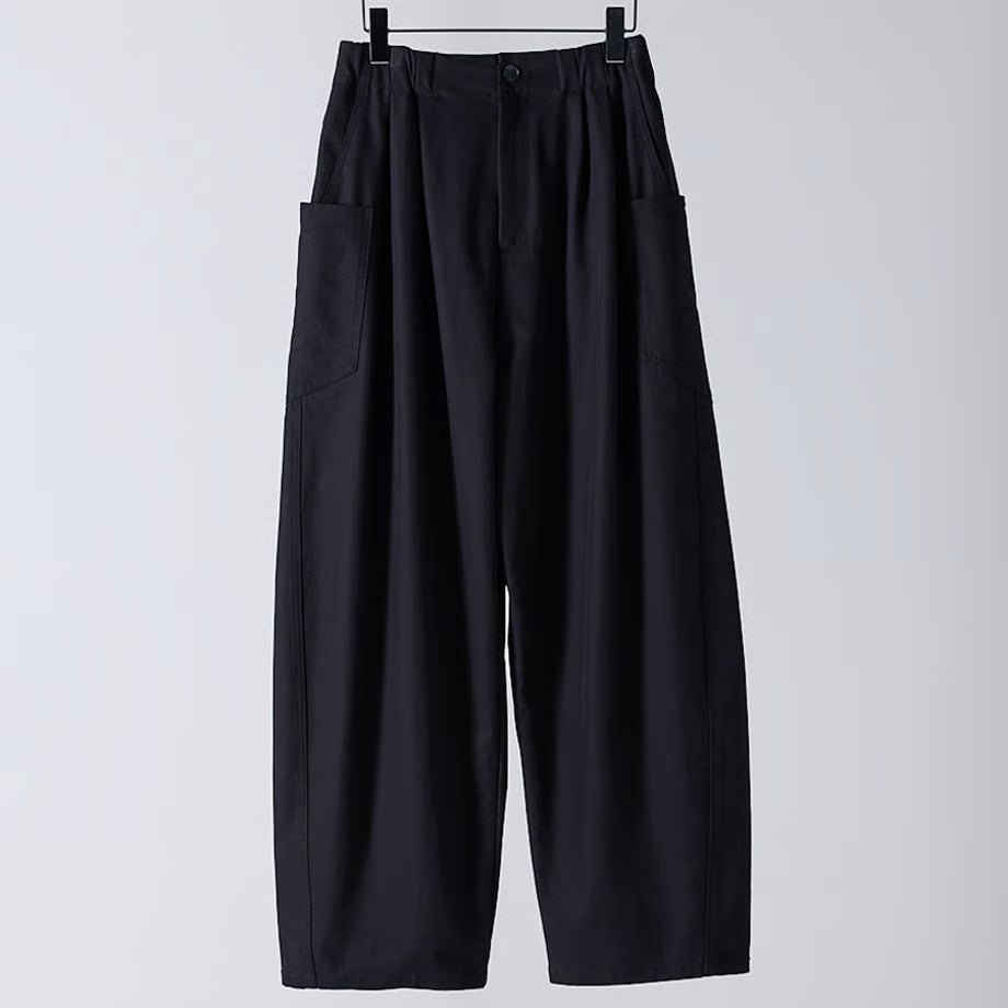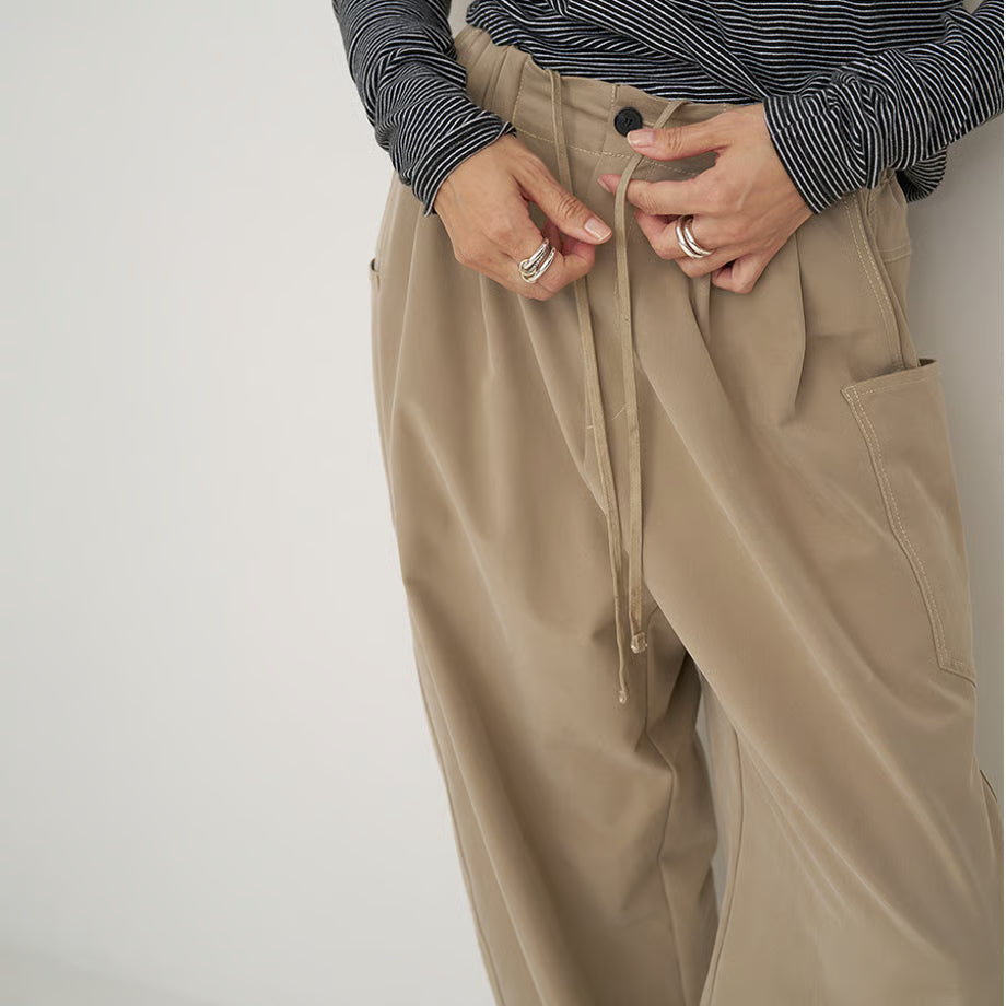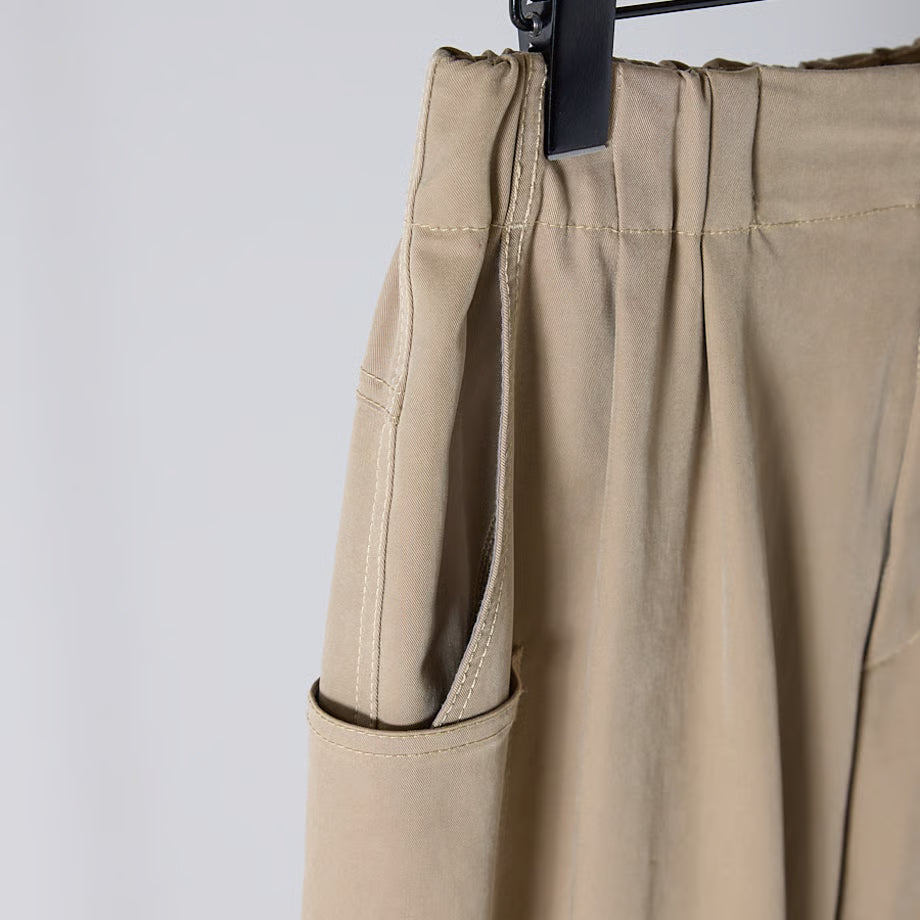 上質なドレープ感と微光沢のあるレーヨン混のツイル生地を使用。女性らしい素材感とマニッシュな雰囲気がMIXされた大人のカジュアルパンツに仕上げました。脇に施したビッグポケットデザインは、ヒップを程よくカバーすることで小尻効果に。ボリューミーでありつつも落ち感があるのでこなれた印象で着こなすことができます。ウエストはALLゴムのファスナー開き仕様、ベルト裏に紐をとおしてあるので、さまざまなサイズに対応できるよう設計しています。裾は靴の上で止まるように少し小さめにしてあるので、裾を引きずりにくくなっています。