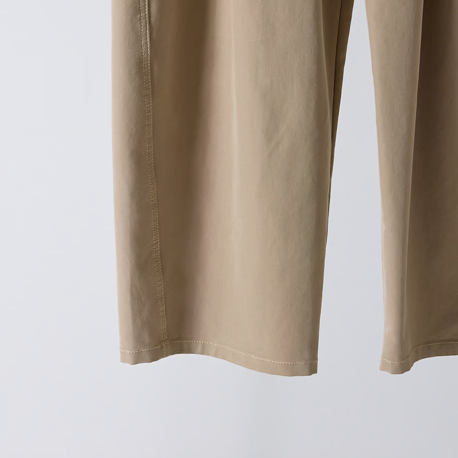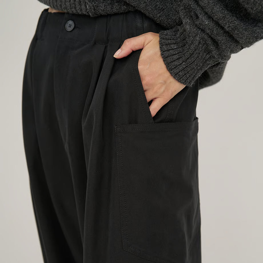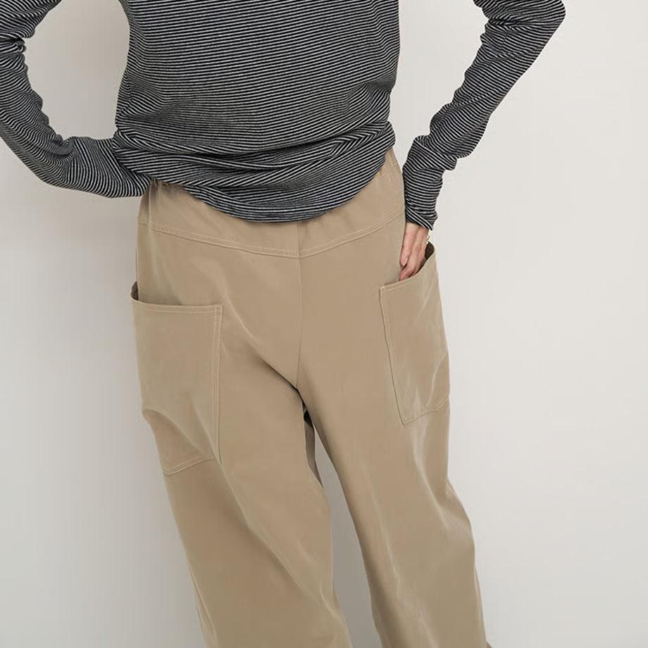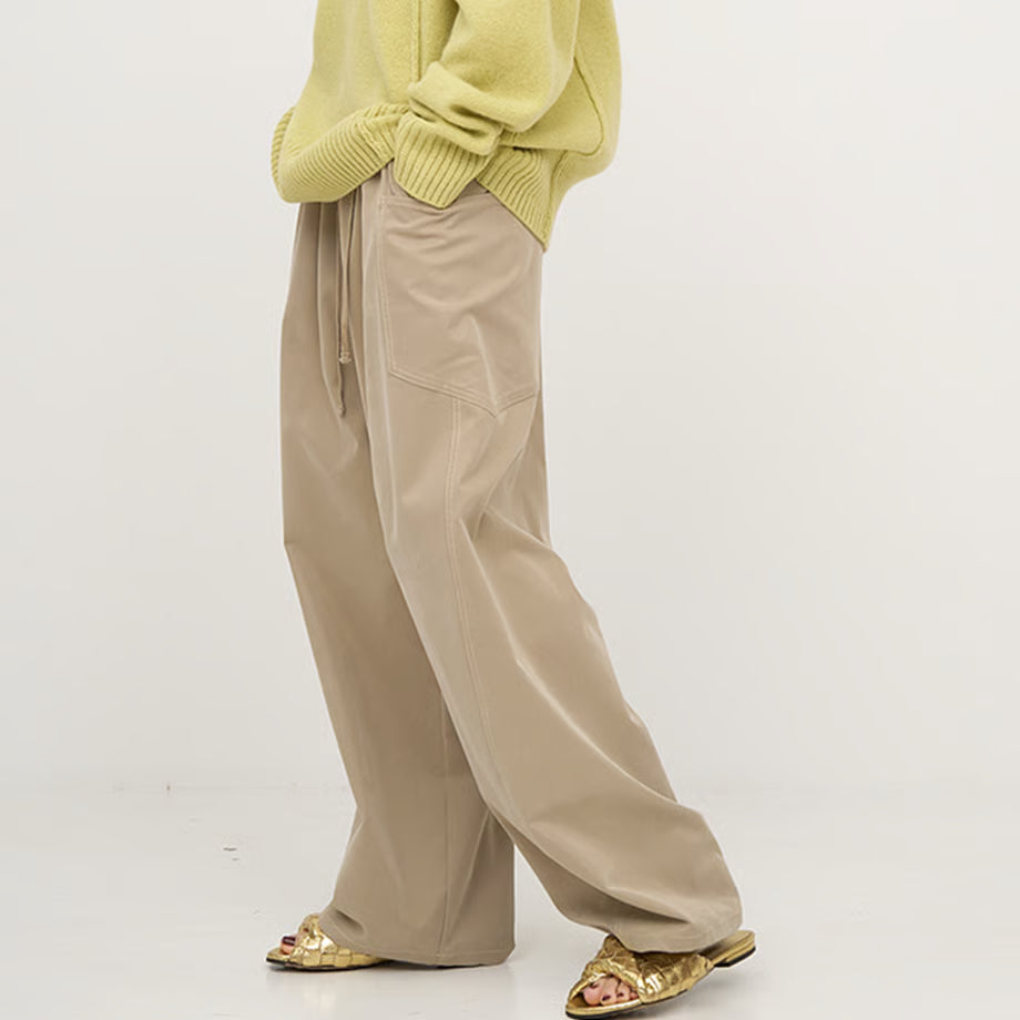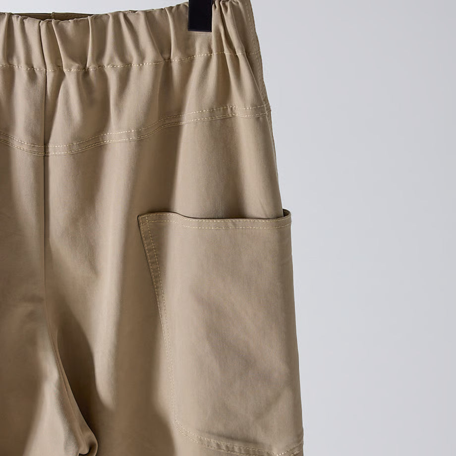 上質なドレープ感と微光沢のあるレーヨン混のツイル生地を使用。女性らしい素材感とマニッシュな雰囲気がMIXされた大人のカジュアルパンツに仕上げました。脇に施したビッグポケットデザインは、ヒップを程よくカバーすることで小尻効果に。ボリューミーでありつつも落ち感があるのでこなれた印象で着こなすことができます。ウエストはALLゴムのファスナー開き仕様、ベルト裏に紐をとおしてあるので、さまざまなサイズに対応できるよう設計しています。裾は靴の上で止まるように少し小さめにしてあるので、裾を引きずりにくくなっています。