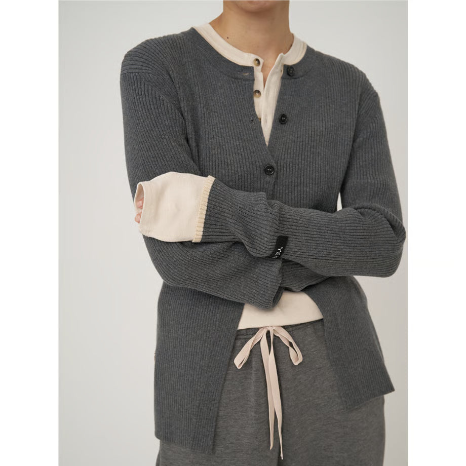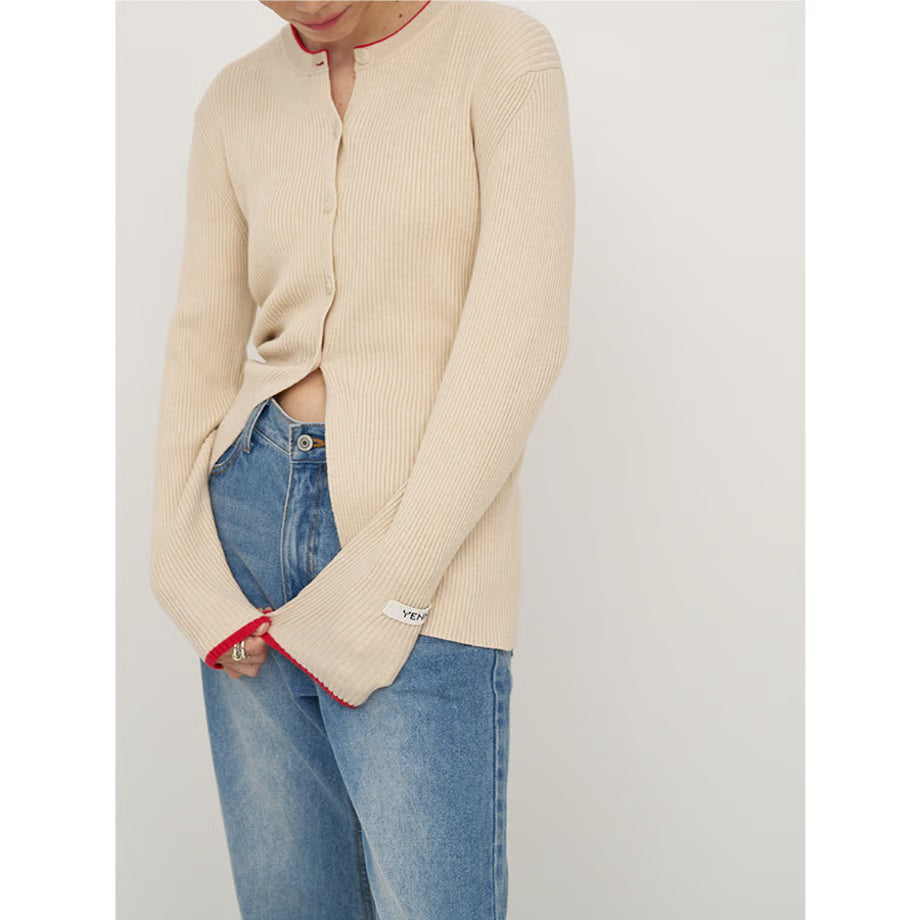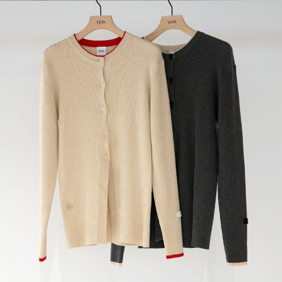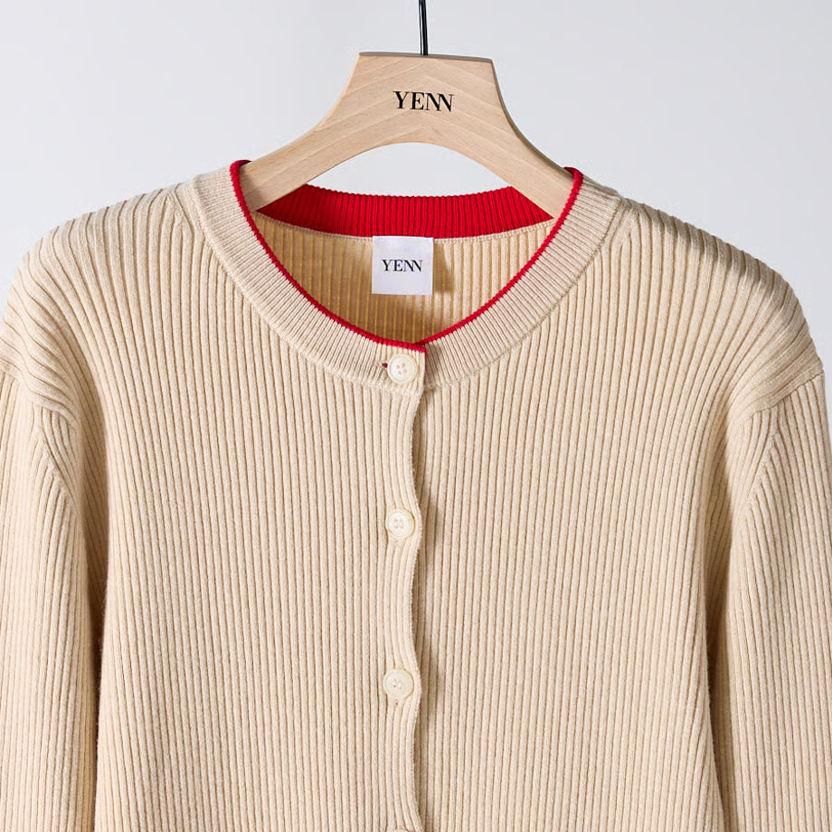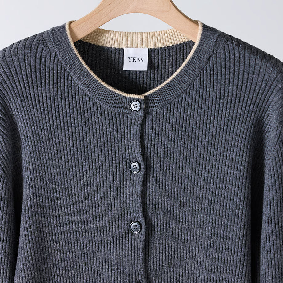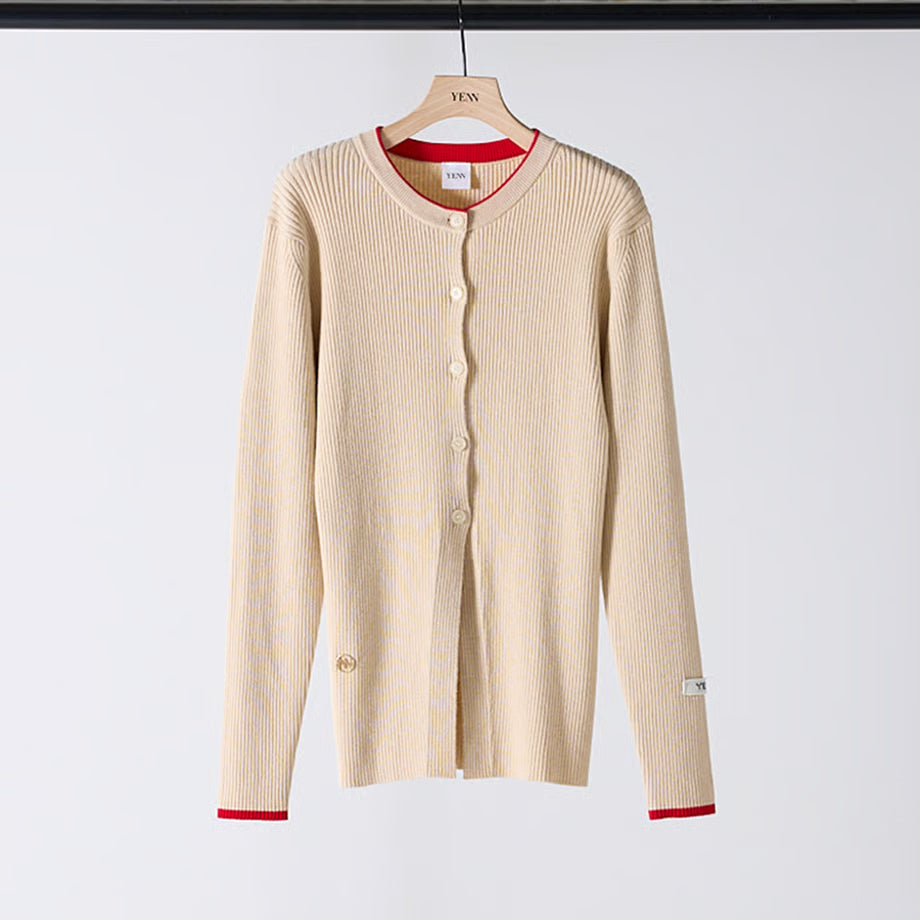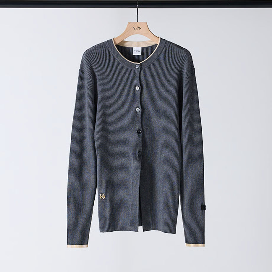 首元の詰まったクルーネックデザインは、トップスとしても、釦を開けてインナーを覗かせたレイヤードスタイルにも、さまざまな着こなしが楽しめるアイテムです。襟ぐりと袖口に施した配色ラインは、主張しすぎないほどよいアクセントに。ロゴチャームや“YENN”ロゴテープなども所々に散りばめて、デザイン要素を盛り込んだニットカーディガンです。