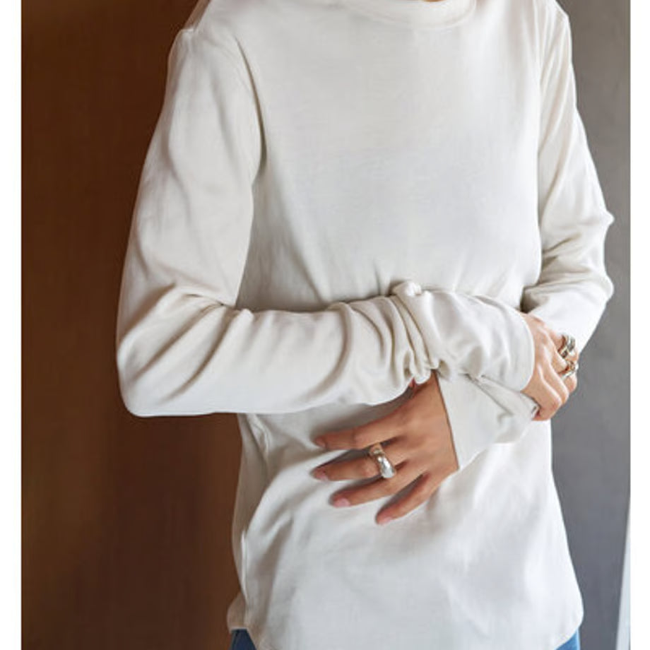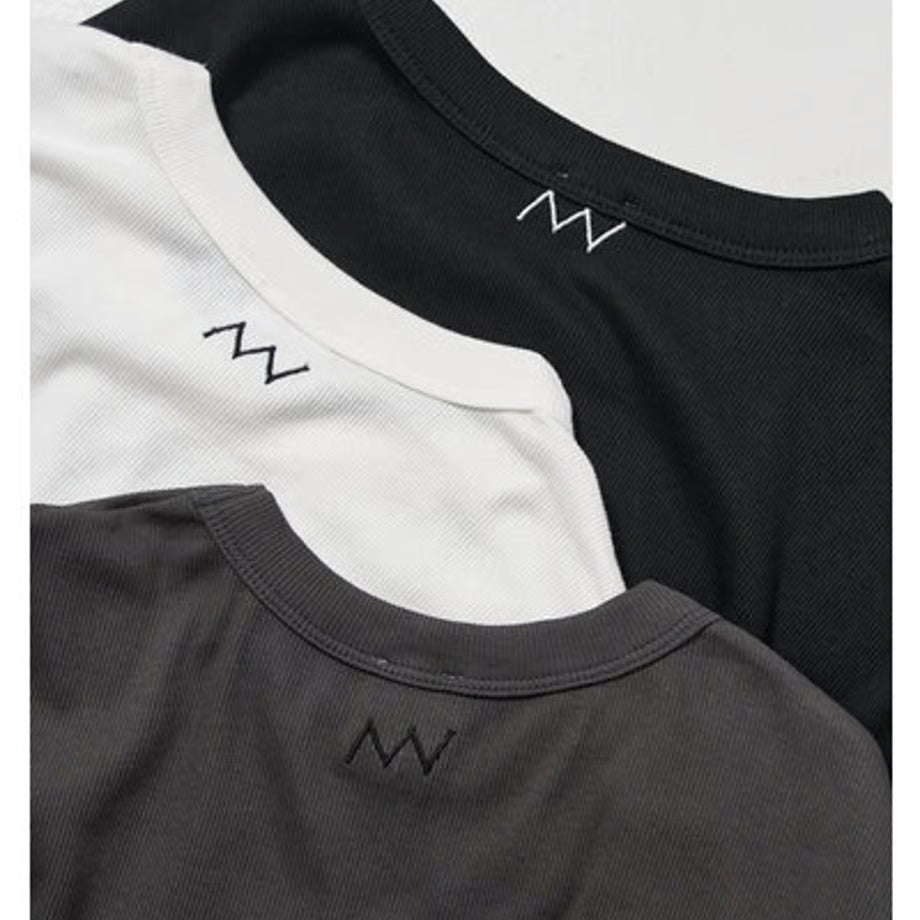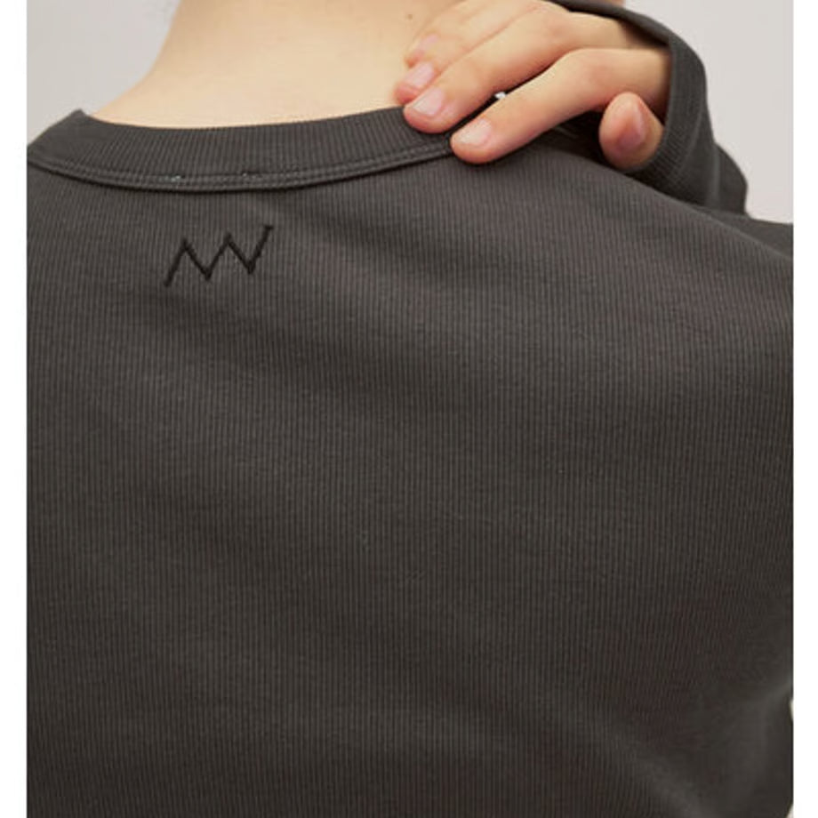繊細な綿素材のリブ生地を使用。通常の糸と比較して格段に毛羽が少なく、シルクのような光沢や滑らかさがでるというのが特徴のコンパクトヤーンを使用したリブ生地を採用、上品な滑らかさのあるコットンリブは肌さわりも良くおすすめです。 程よく体に沿うようにデザインされているので、レイヤードのインナーにも最適です。 後衿ぐりに施したワンポイント刺繍もほどよいアクセントに。 衿ぐりはあえて狭く設定、ニットやシャツの下に着たときに衿ぐりからTシャツを覗かせるスタイリングがおすすめの着こなしです。